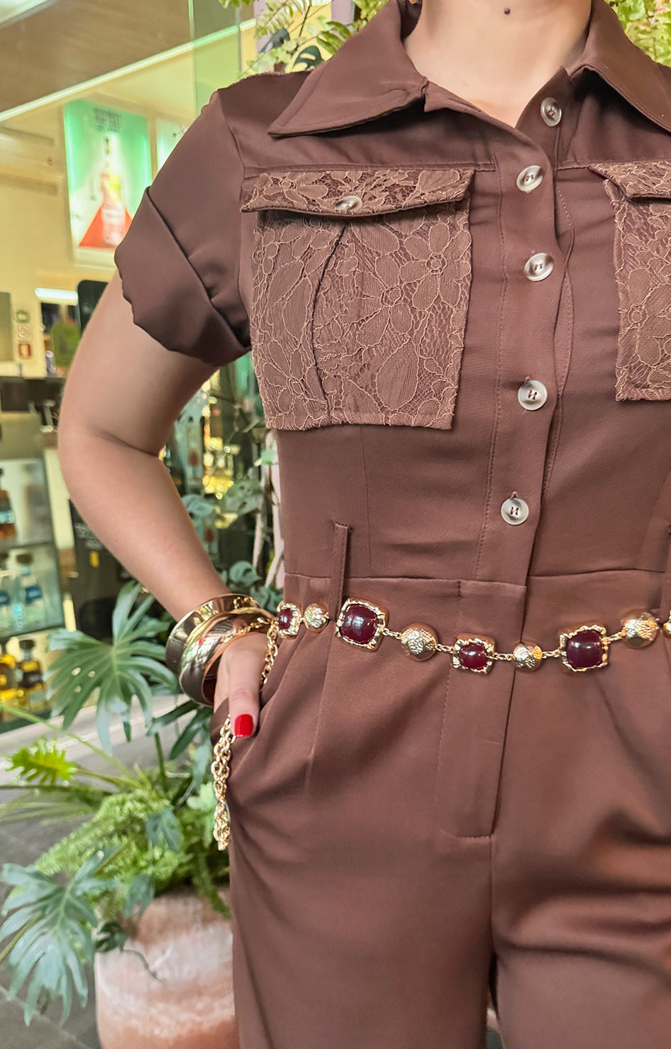 Este palazzo café combina un estilo camisero con manga corta para ofrecer una sensación suave al tacto y un diseño cómodo. Incluye un cinturón que realza la figura, aportando un toque elegante y versátil ideal para distintas ocasiones. Su confección se adapta perfectamente al cuerpo, asegurando comodidad y sofisticación en cada uso.