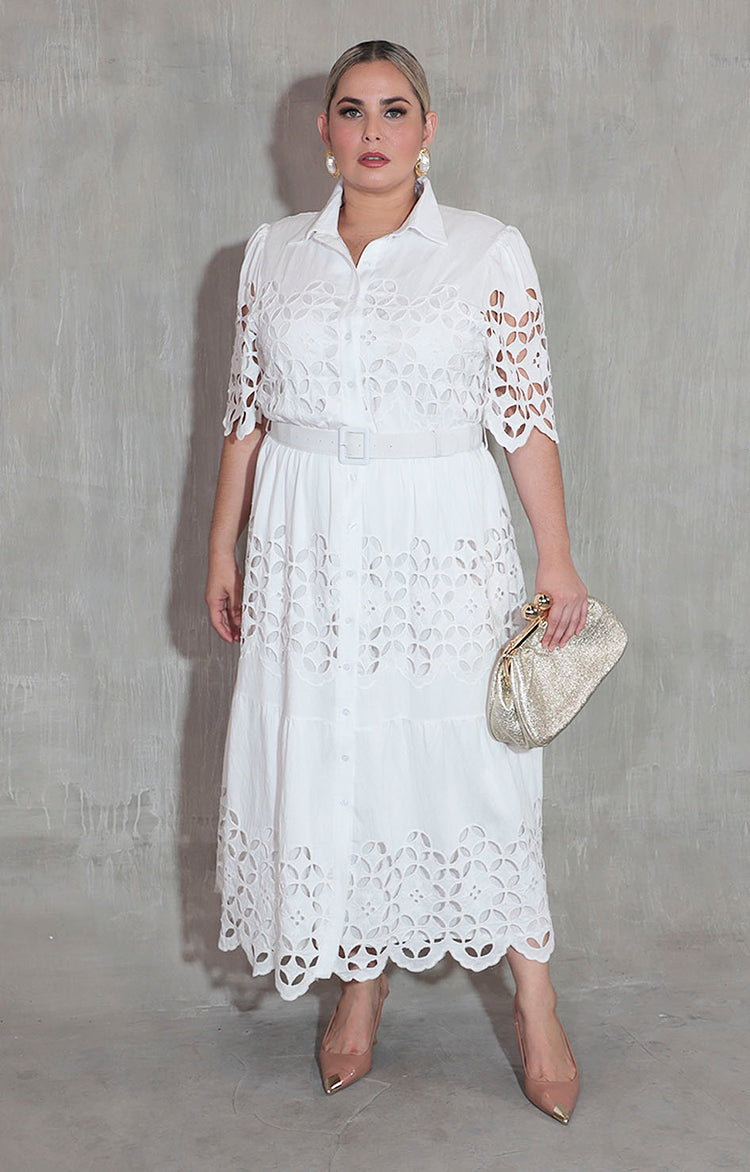 Vestido blanco en guipur confeccionado en tela suave que proporciona comodidad durante todo el día. Diseño camisero clásico que combina elegancia con versatilidad, perfecto para ocasiones formales e informales. Incluye cinturón ajustable que define la silueta y permite personalizar el ajuste según tus preferencias. El guipur añade un toque sofisticado y texturizado a la prenda, creando un look refinado y contemporáneo. Una pieza esencial para cualquier guardarropa que busca calidad y estilo.