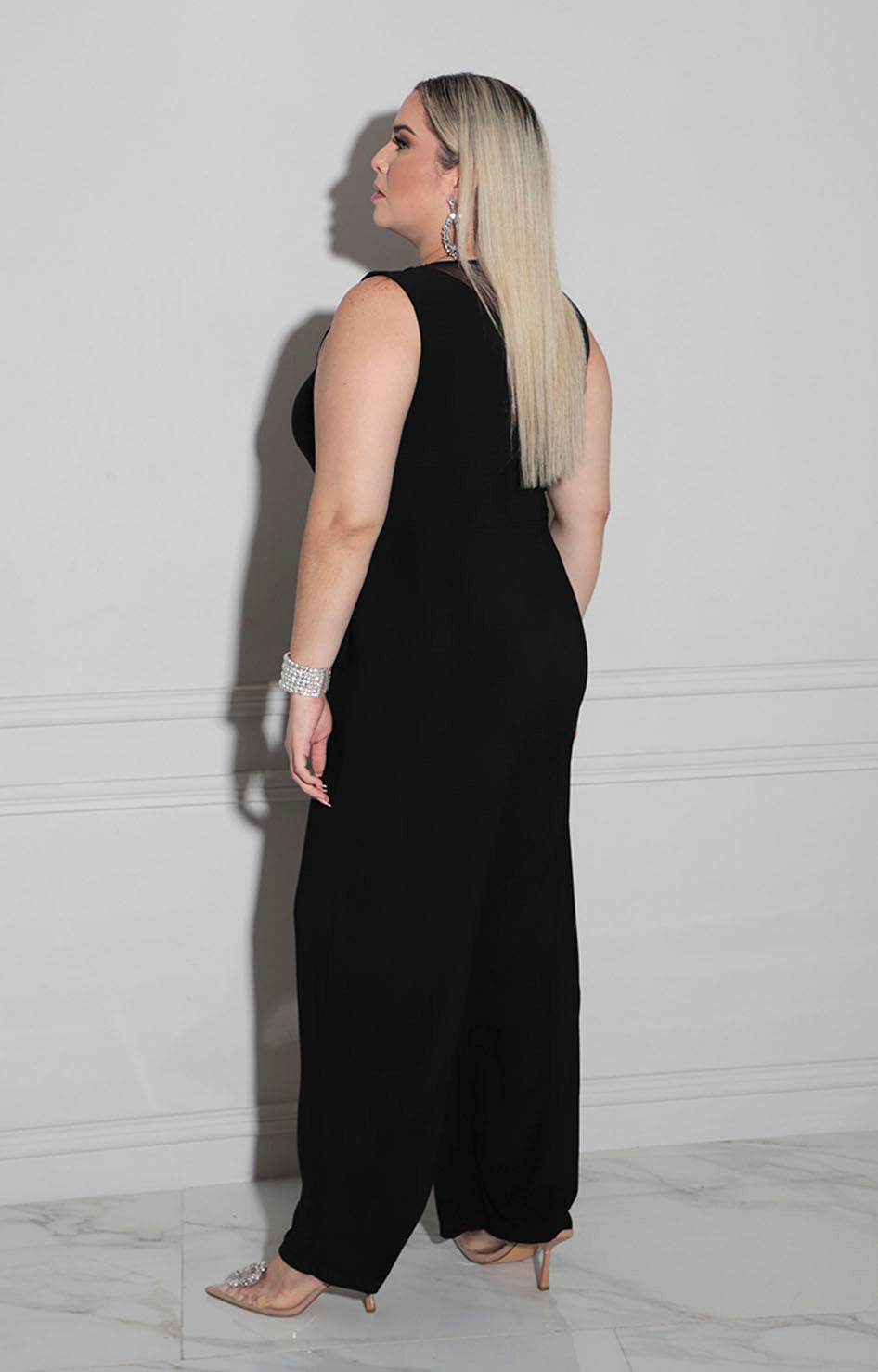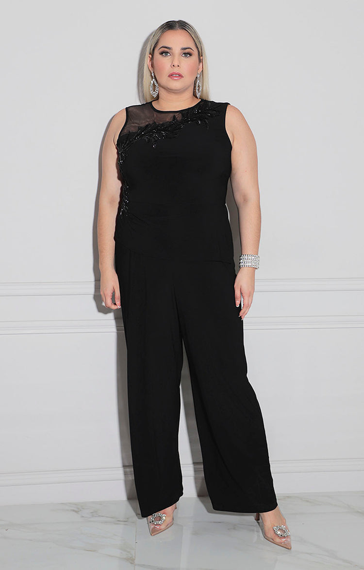 Palazzo negro de corte elegante confeccionado en tela suave que proporciona comodidad durante todo el día. Destaca por su cuello circular clásico y cierre funcional en la espalda que facilita el vestido. El bordado de flores al frente añade un toque de sofisticación y detalle artesanal, transformándolo en una pieza versátil ideal para ocasiones formales o eventos especiales. Una prenda que combina funcionalidad con estilo refinado.