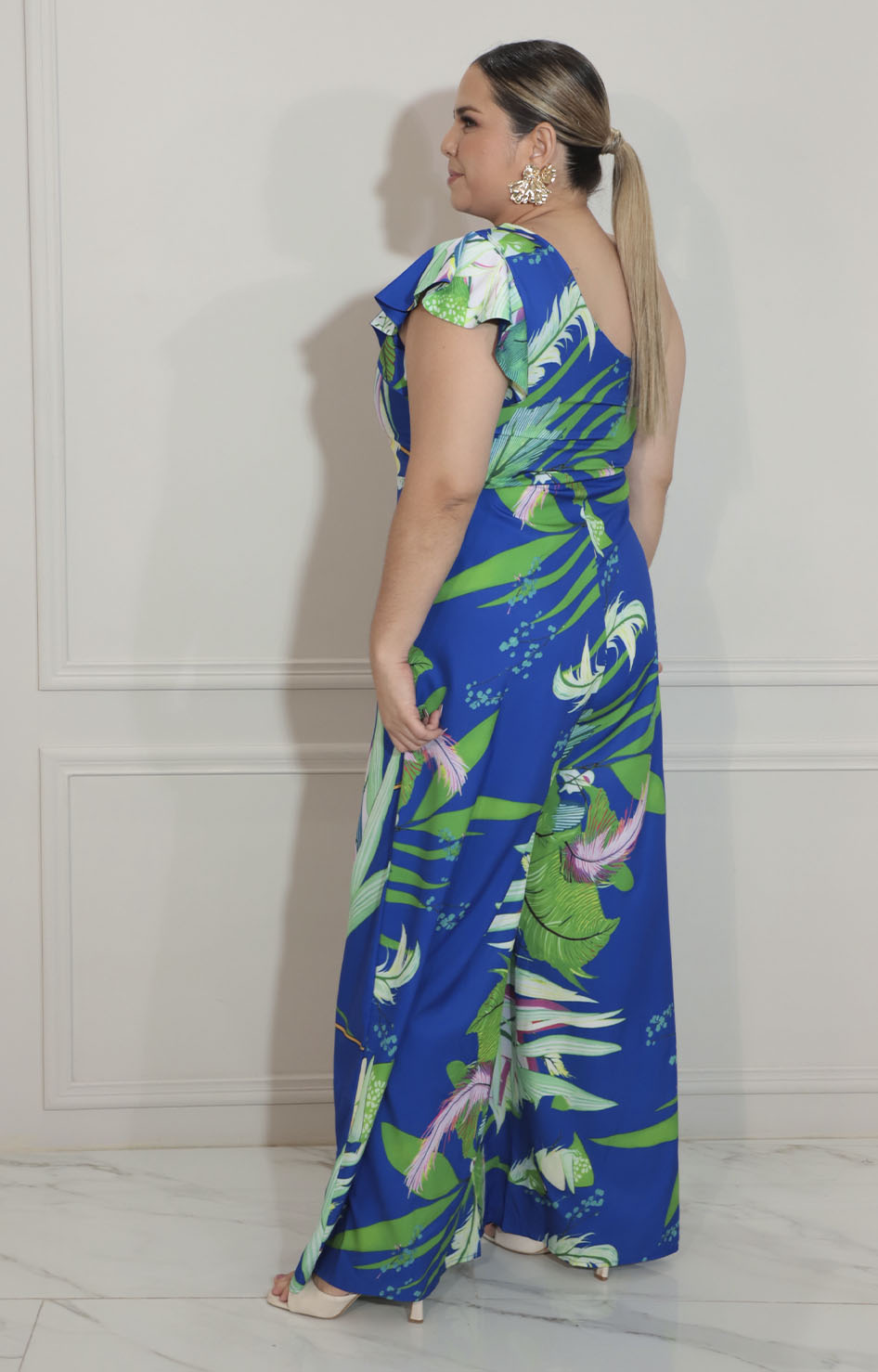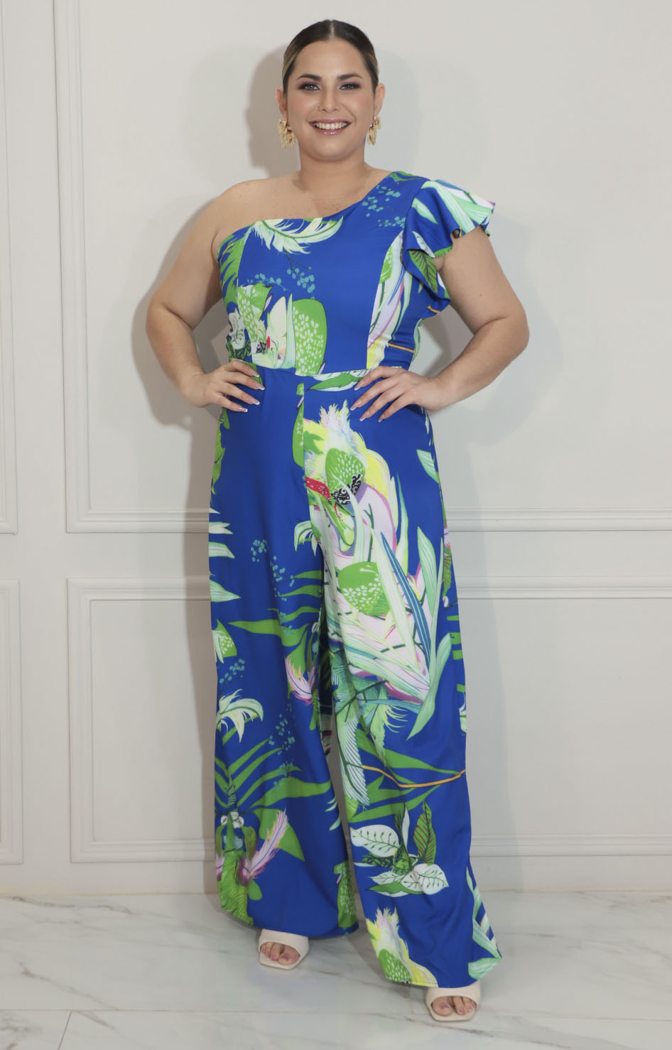 Corte asimétrico con escalora al mismo nivel de la asimetría; suave con elasticidad al tacto. Estampado de flores grandes en colores llamativos.