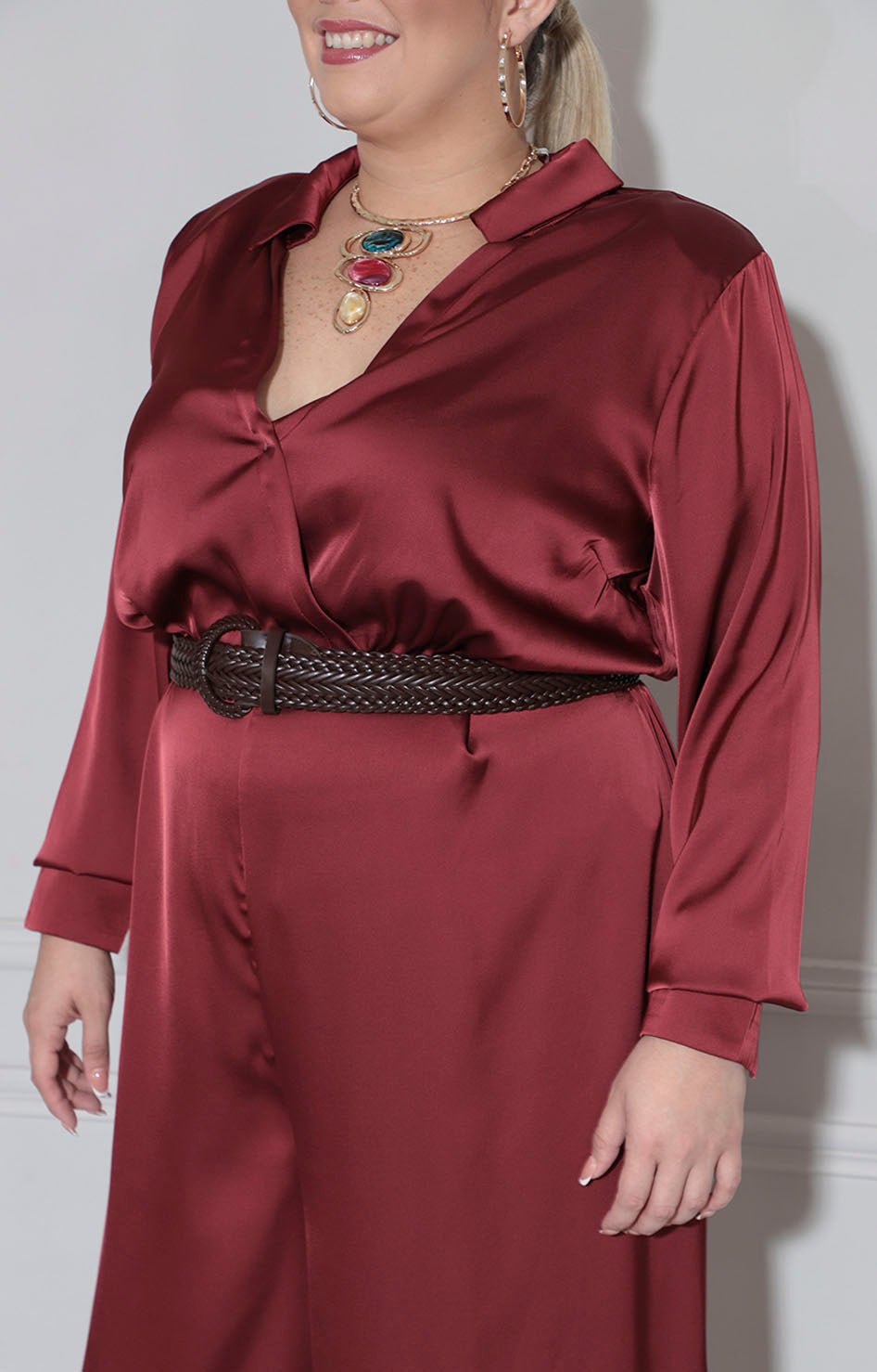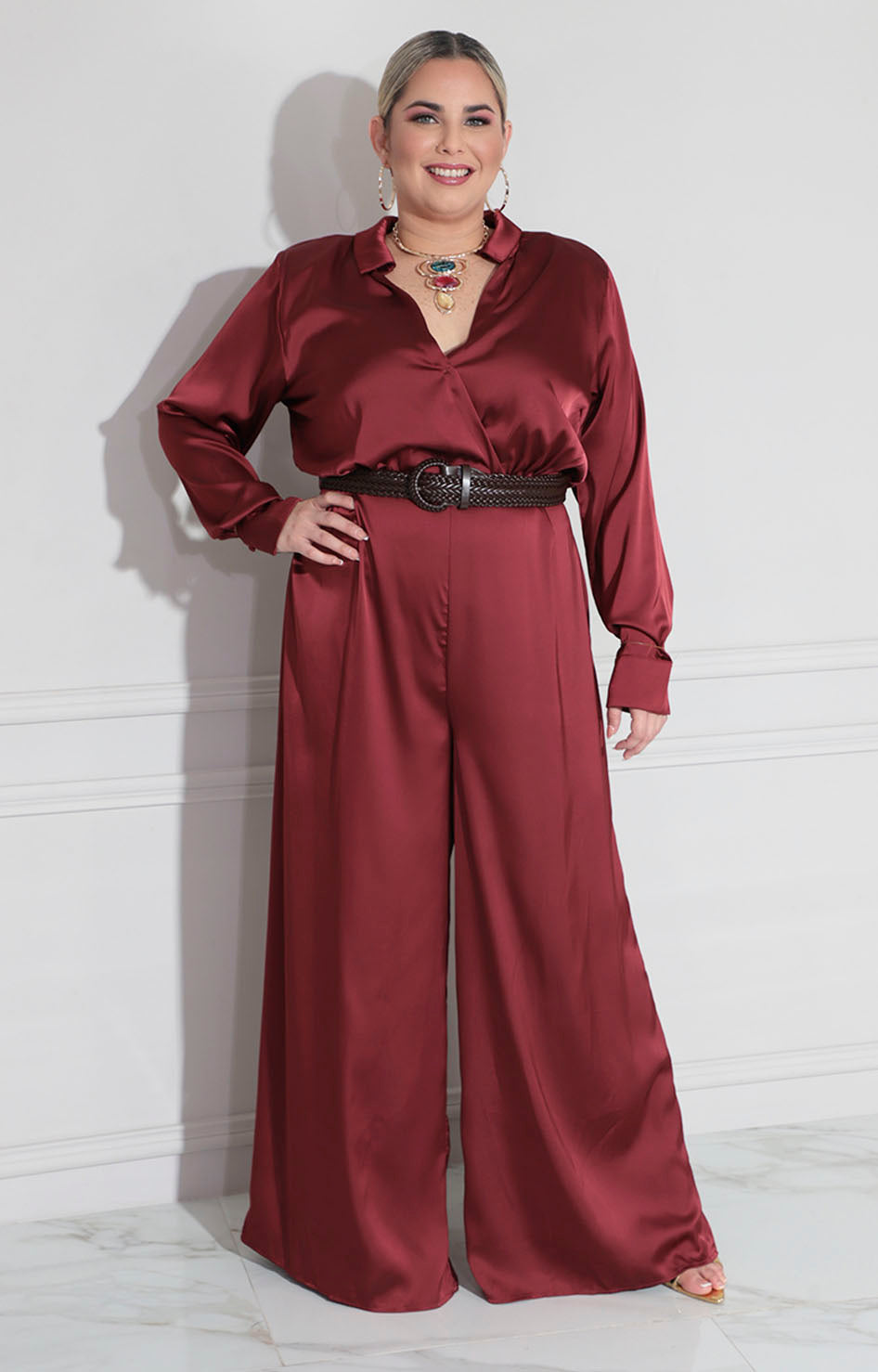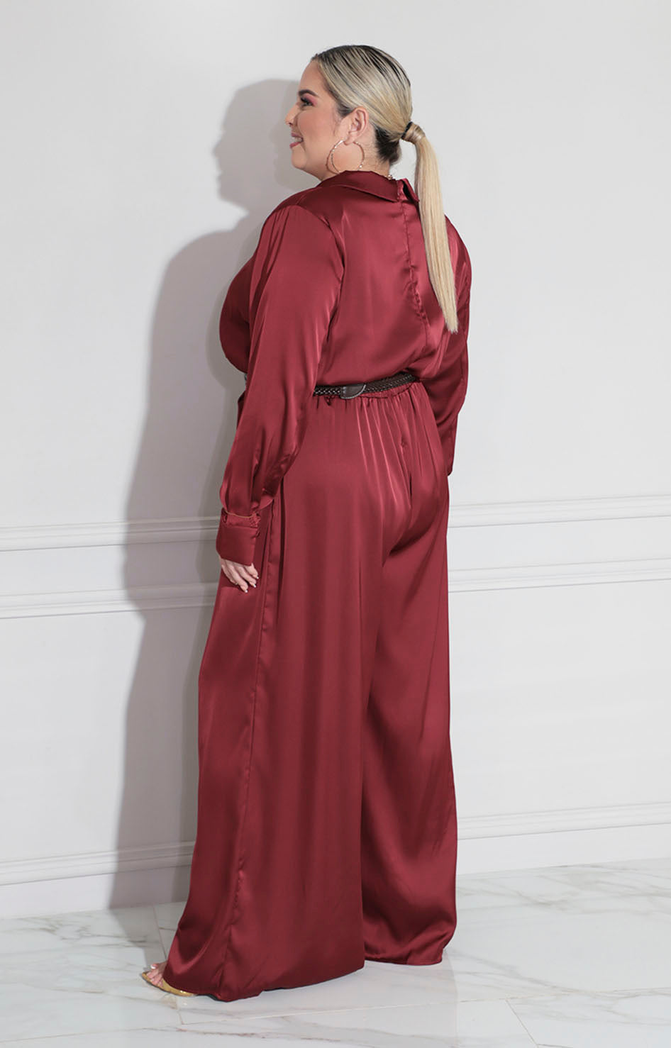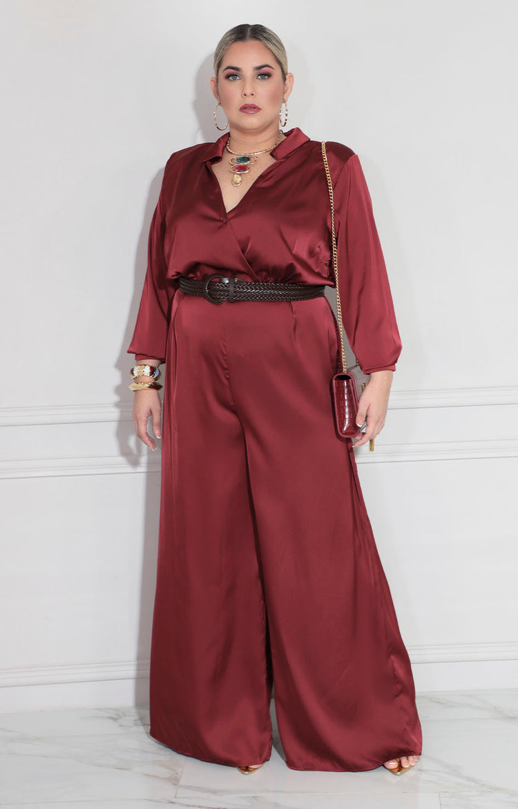 Palazzo en tono vino confeccionado en tela suave que proporciona comodidad durante todo el día. Diseño de manga larga que ofrece versatilidad para diferentes ocasiones y climas. Incluye cinturón a juego que define la silueta y permite ajustar el fit según tus preferencias. Una pieza versátil que combina elegancia con practicidad, ideal para crear looks sofisticados tanto en contextos formales como casuales.