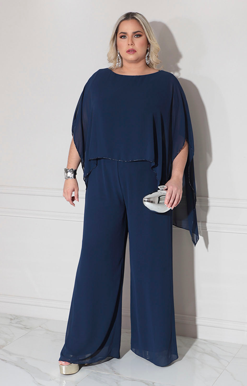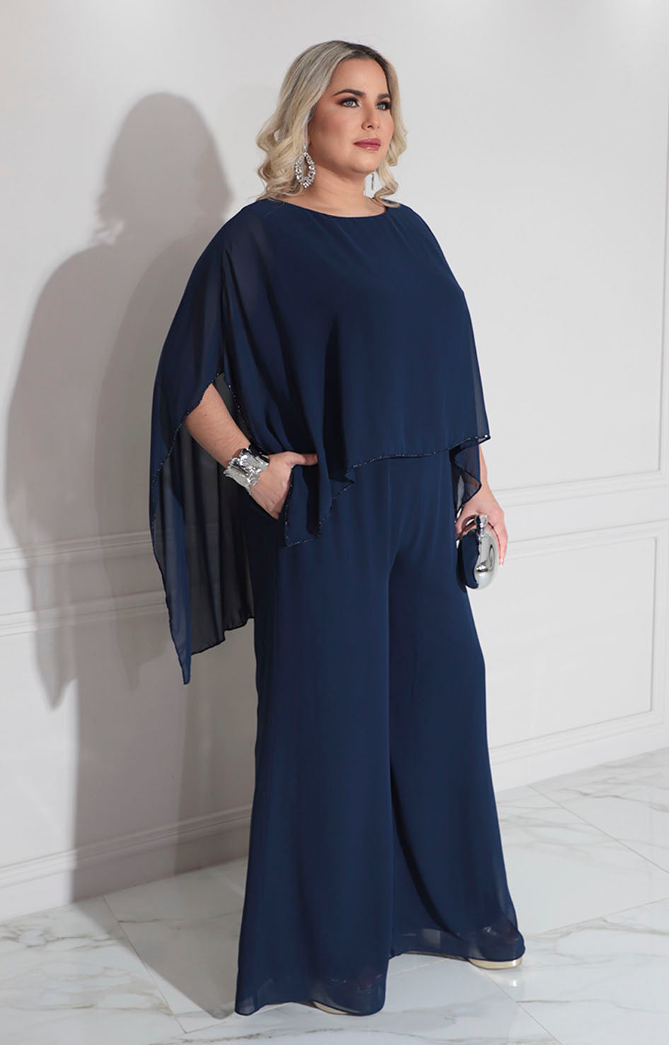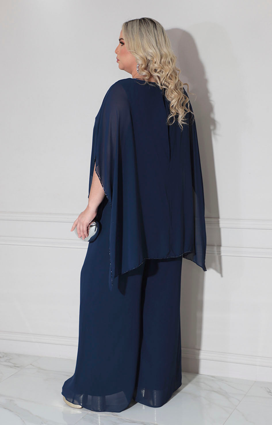 Palazzo de gala confeccionado en tela suave que proporciona comodidad y elegancia en cada movimiento. Diseño sofisticado con cuello circular que favorece el escote, complementado por una solapa en la espalda adornada con borde de pedrería bordada que añade un toque de distinción. Los bolsillos laterales funcionales permiten practicidad sin comprometer el estilo. Perfecto para eventos especiales donde se requiere presencia y refinamiento.