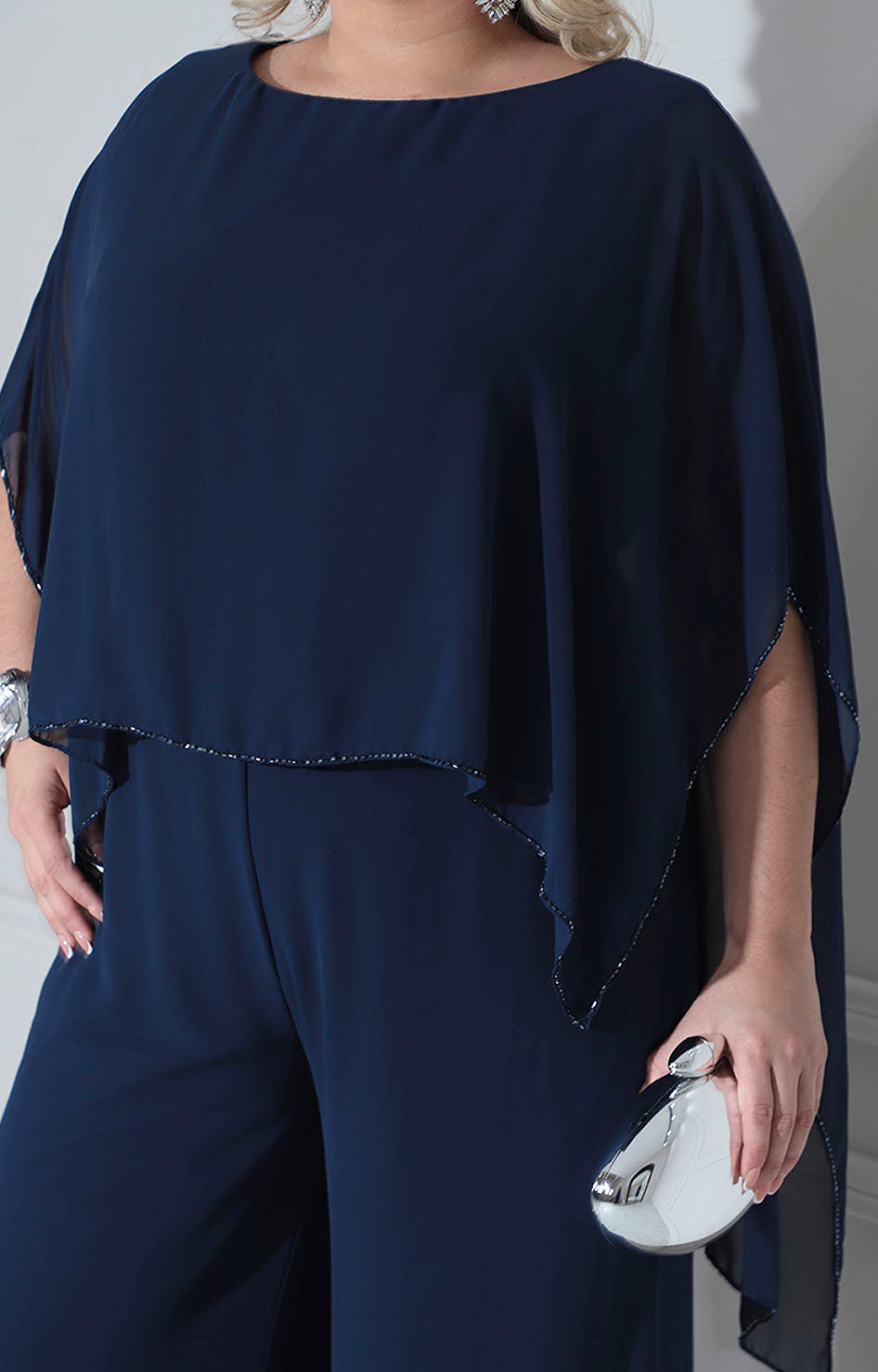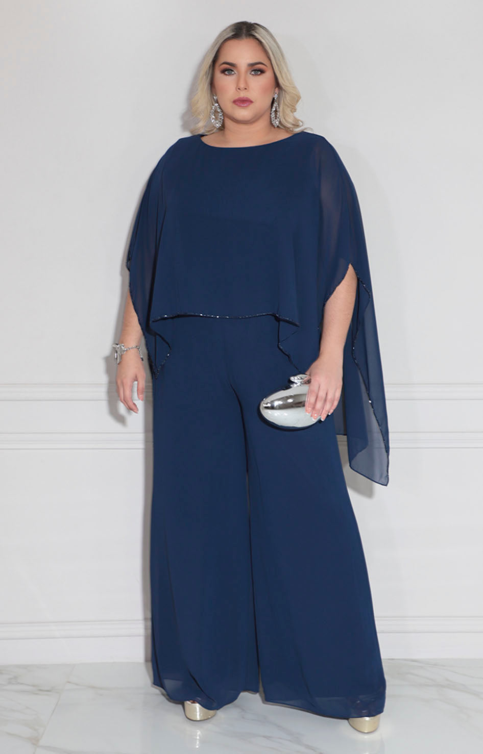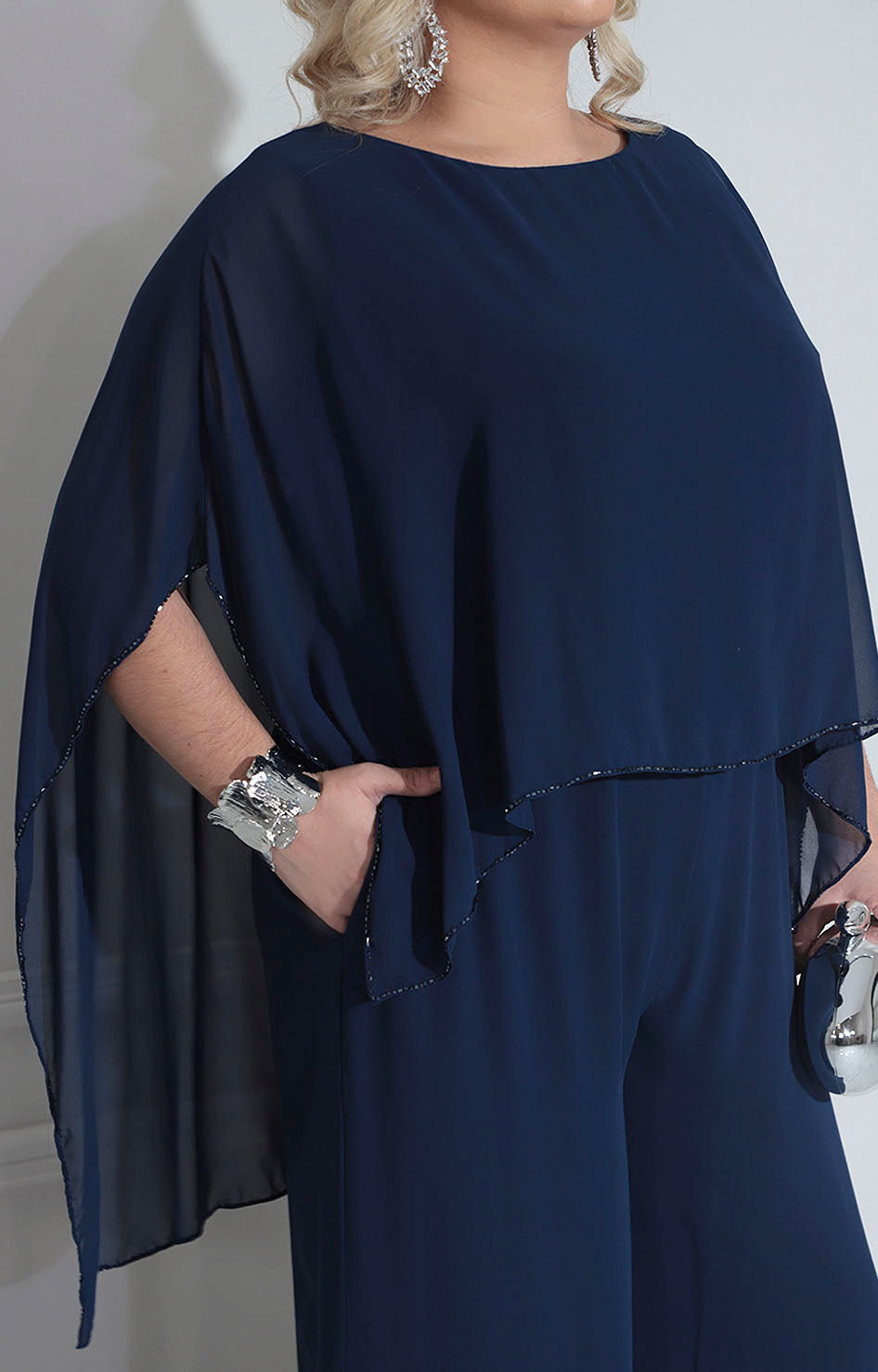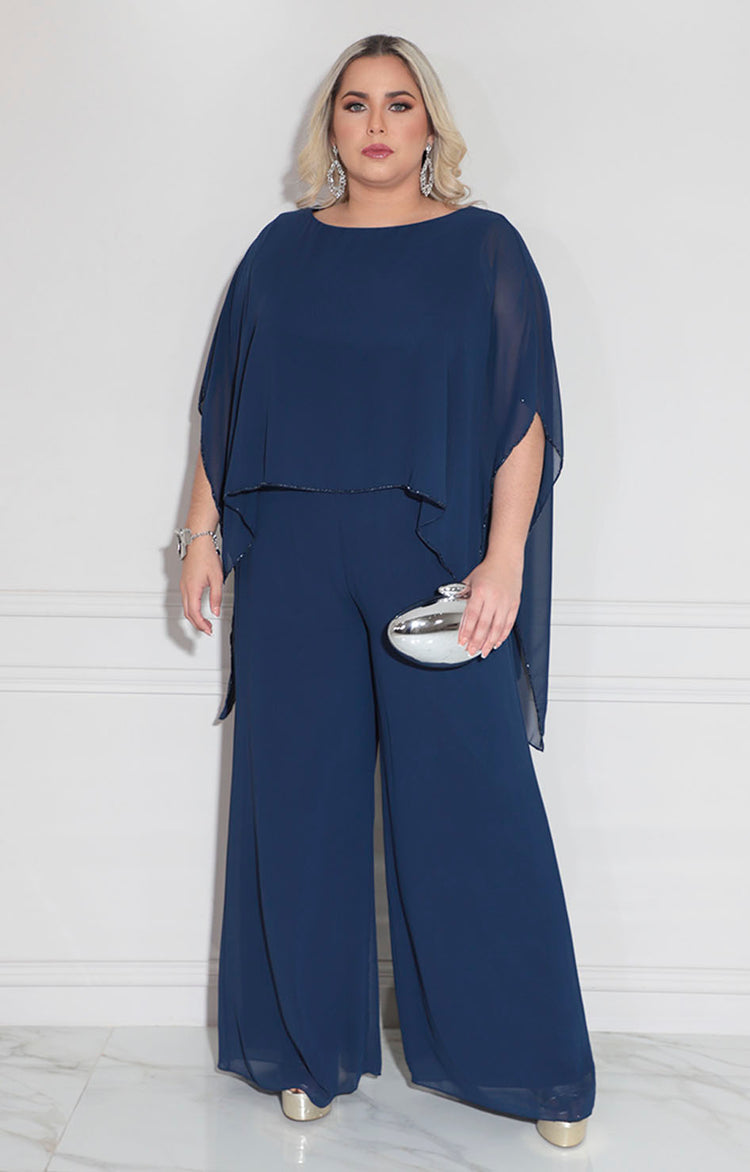 Palazzo de gala confeccionado en tela suave que proporciona comodidad y elegancia en cada movimiento. Diseño sofisticado con cuello circular que favorece el escote, complementado por una solapa en la espalda adornada con borde de pedrería bordada que añade un toque de distinción. Los bolsillos laterales funcionales permiten practicidad sin comprometer el estilo. Perfecto para eventos especiales donde se requiere presencia y refinamiento.