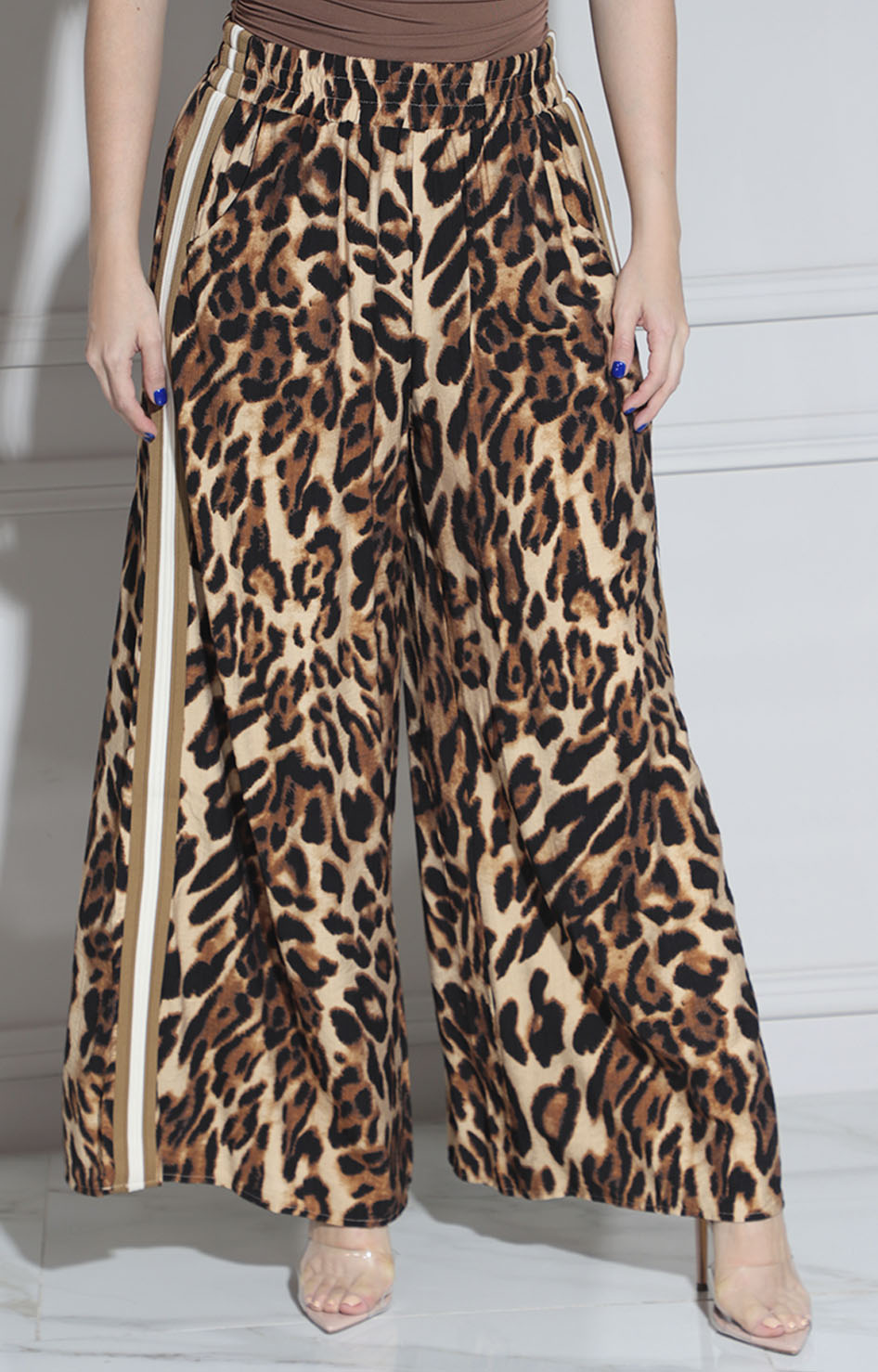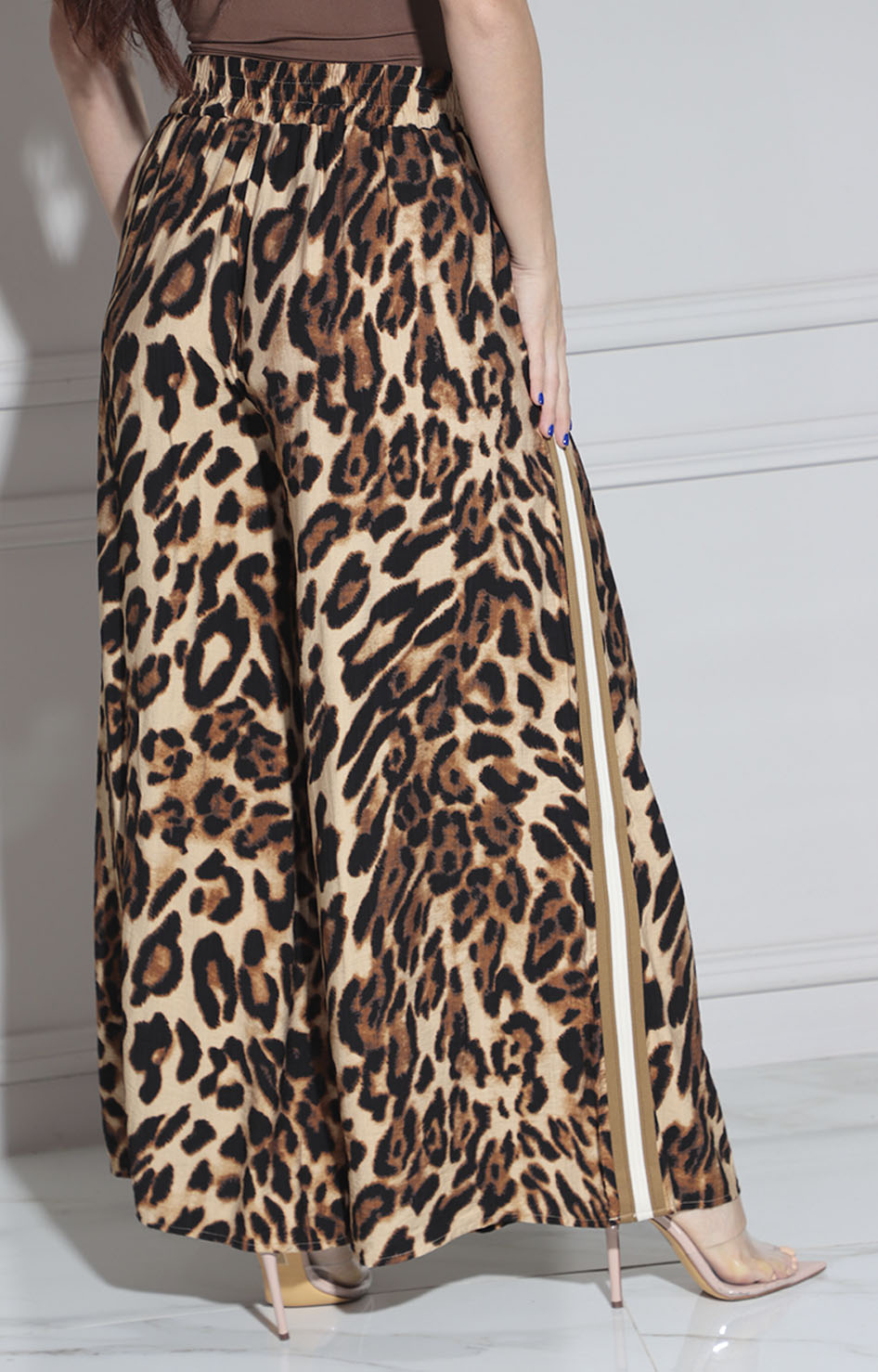 Pantalón de corte amplio confeccionado en tela suave que proporciona comodidad durante todo el día. Diseño versátil con estampado cheeta en tonos café que se adapta a múltiples estilos. Cuenta con resorte en la pretina para un ajuste seguro y flexible, complementado con bisel en blanco que añade un detalle de contraste refinado. Prenda versátil ideal para crear looks casuales con carácter.