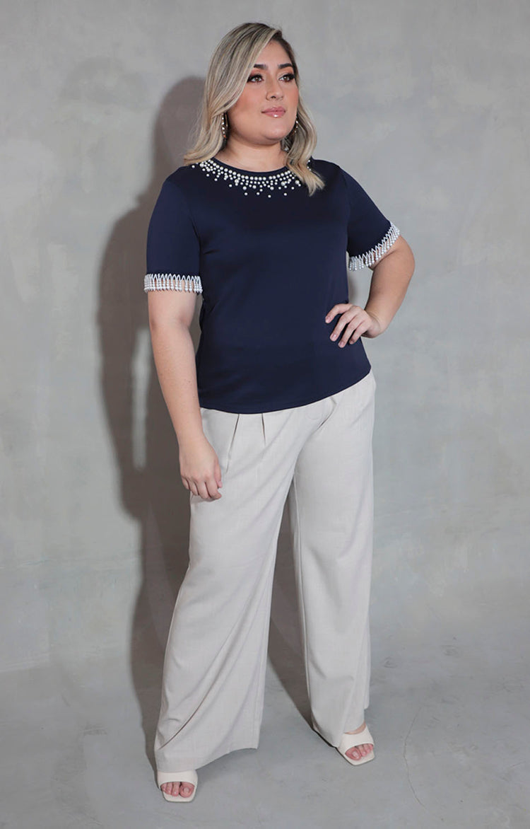 De tela suave y ligera, corte recto y bolsillos laterales. Con trabillas en pretina, estilo formal.