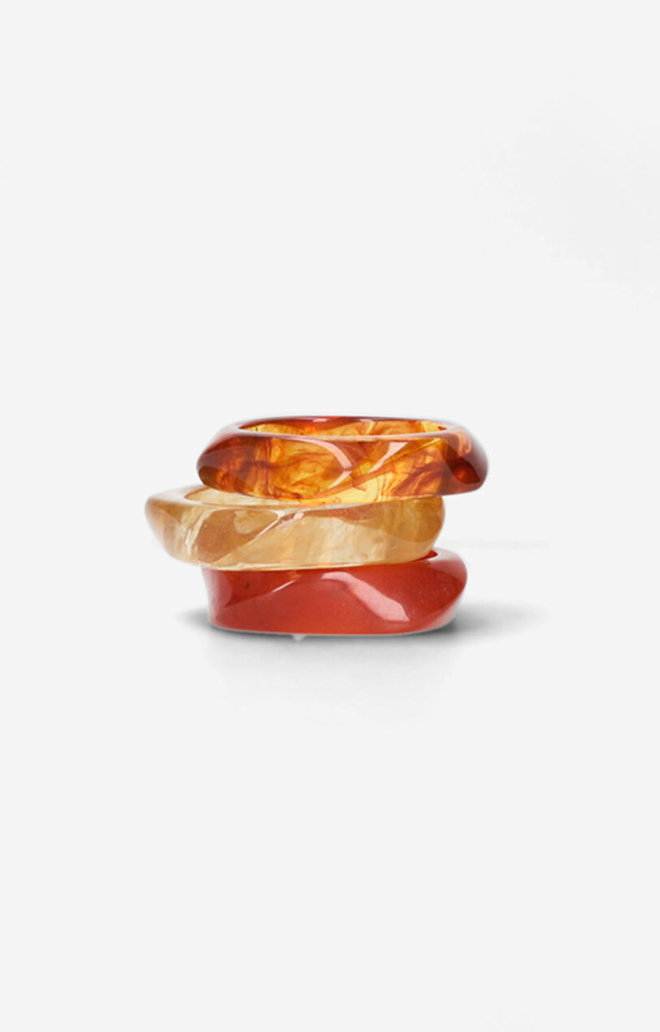 Este trío de pulseras está elaborado en acrílico con un diseño chedrón carey, aportando un estilo sofisticado y moderno. Su ligereza y resistencia las hacen ideales para el uso diario, brindando comodidad sin sacrificar elegancia. Perfectas para combinar entre sí o con otros accesorios, estas pulseras resaltan cualquier atuendo con un toque experto y contemporáneo.