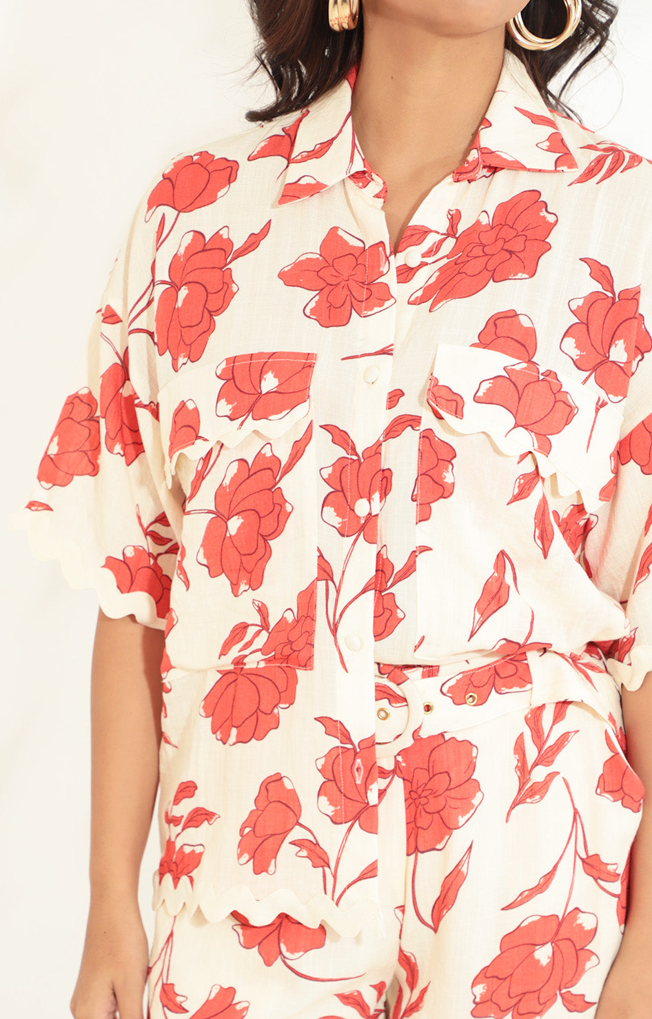 Este conjunto beige con flores combina una blusa estilo camisera, suave al tacto y diseñada para ofrecer máxima comodidad, con un short que presenta un bies en la zona inferior, aportando un detalle sutil y elegante. Perfecto para un look fresco y armonioso, su tejido ligero y acabado delicado lo hacen ideal para diversas ocasiones.