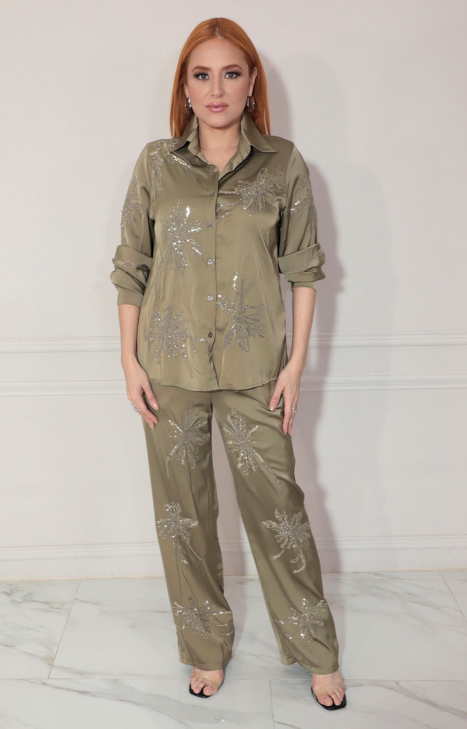 Este conjunto verde bordado combina elegancia y comodidad con su tela ligera y suave al tacto. Confeccionado en dos piezas, incluye una blusa estilo camisera con un delicado bordado de lentejuelas en tono a tono que realza su diseño sin perder sutileza, y un pantalón recto que ofrece un ajuste cómodo y versátil. Ideal para quienes buscan un outfit sofisticado y fresco, perfecto para diversas ocasiones.