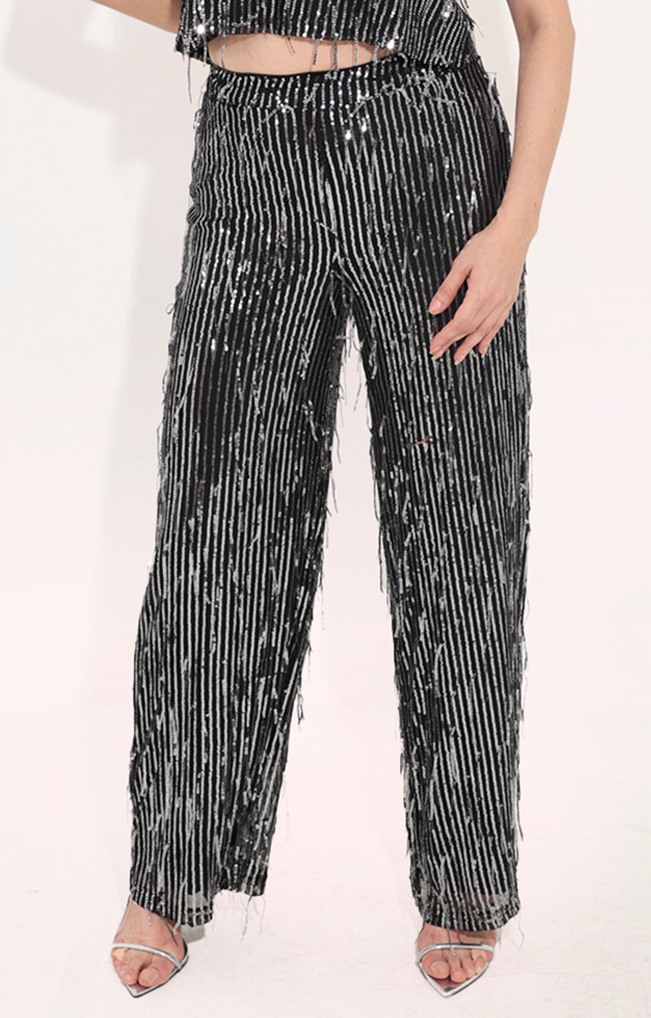 El pantalón negro con lentejuelas en plata es la opción perfecta para añadir un toque de glamour y sofisticación a tu look. Con su base negra clásica y las lentejuelas plateadas que capturan la luz, este pantalón aporta un estilo elegante y moderno, ideal para eventos nocturnos, fiestas o salidas especiales.