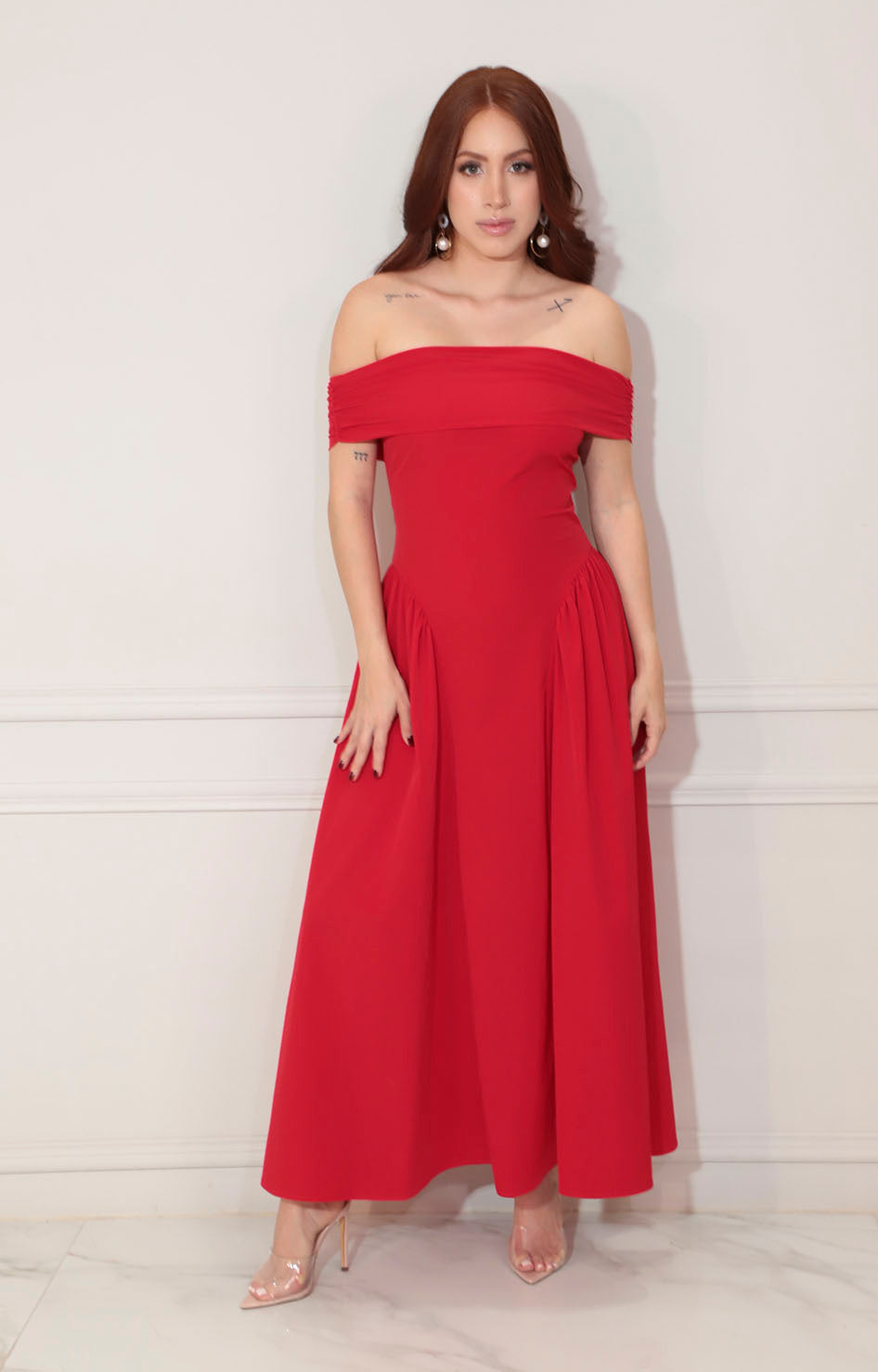 Este vestido de gala rojo destaca por su confección suave al tacto, que garantiza una comodidad excepcional durante su uso. Su diseño incluye un cierre práctico y elegante en la espalda, facilitando su ajuste. El corte circular aporta un volumen y movimiento sofisticados, mientras que el estilo off-shoulder realza la figura y añade un toque de distinción y feminidad. Ideal para eventos formales donde se busca un look refinado y confortable.