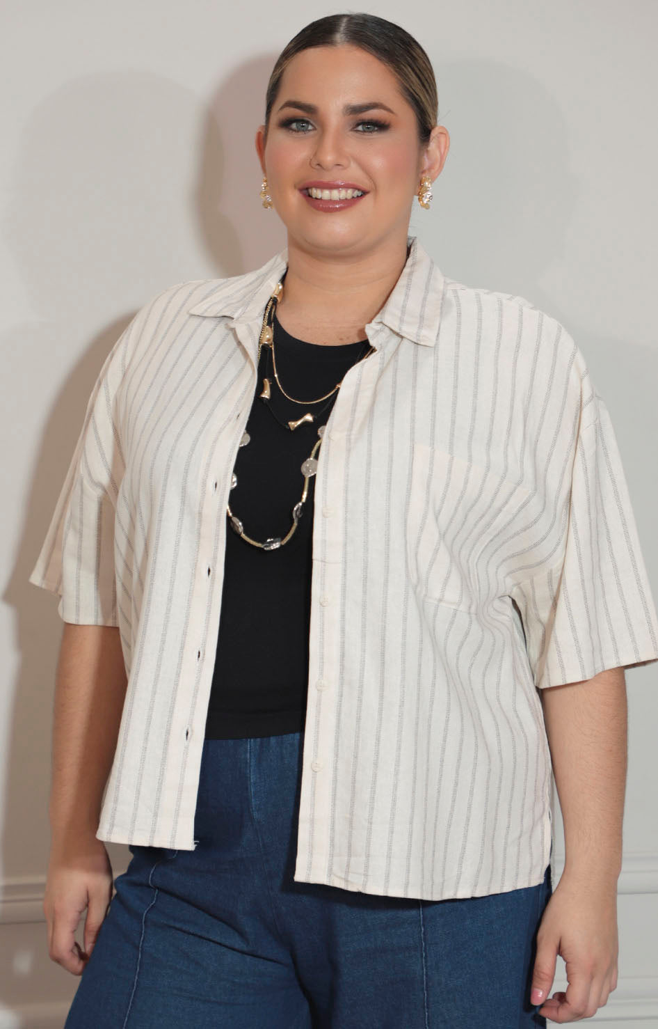 Esta blusa beige de rayas con botones frontales combina estilo y comodidad para tu día a día. Su diseño clásico con botones facilita el uso y añade un toque elegante a cualquier conjunto. Perfecta para ocasiones casuales o formales, te brinda versatilidad y un look fresco y sofisticado.