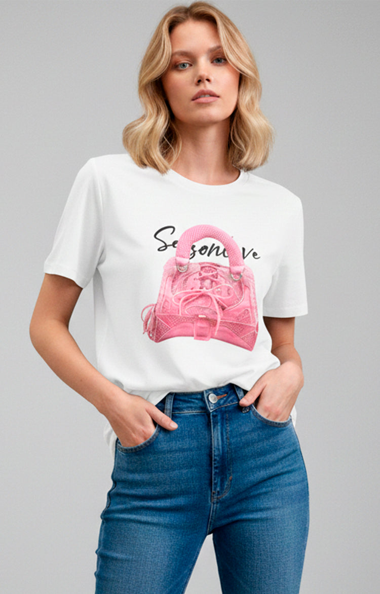 Blusa básica confeccionada en algodón suave y cómodo, ideal para el uso diario. Destaca por su original estampado de bolsa en 3D que le da un toque moderno y diferenciador. Perfecta para combinar con tus prendas favoritas, esta blusa ofrece versatilidad y estilo en una sola pieza. Su tela de calidad garantiza durabilidad y comodidad durante todo el día.