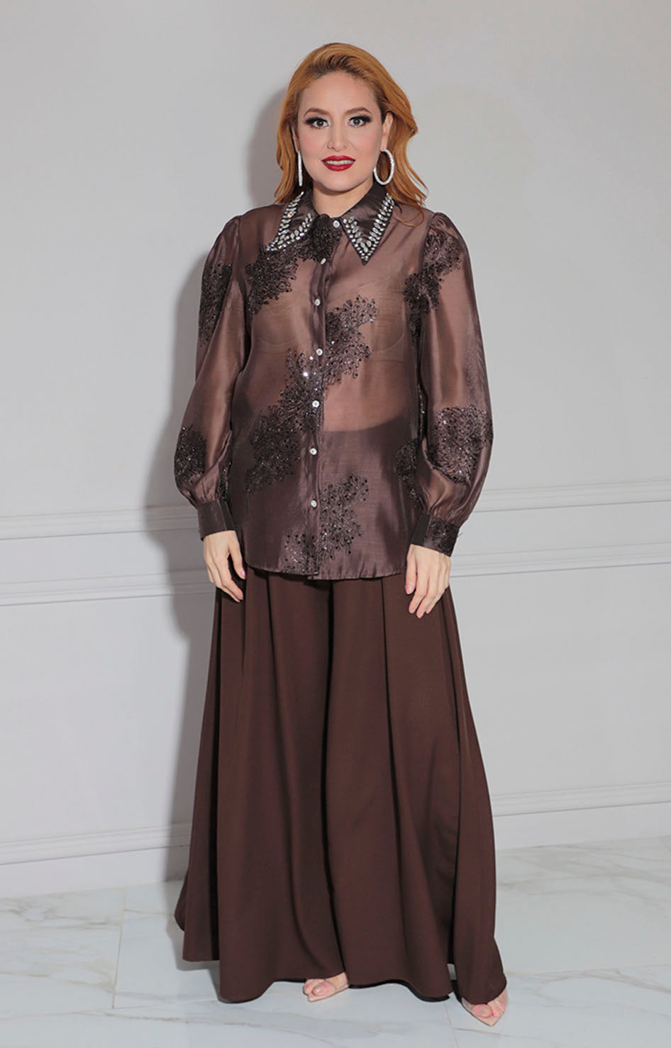 Camisera café con manga larga que combina comodidad y elegancia. Confeccionada en tela suave al tacto, ofrece una experiencia de uso excepcional durante todo el día. Destaca por su cuello adornado con pedrería que añade un toque sofisticado, complementado por botones en estilo brillo que realzan el diseño. Una prenda versátil ideal para crear looks refinados tanto en contextos casuales como más formales.
