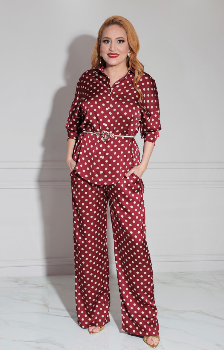 Conjunto elegante en tono vino con detalles de lunares que añaden sofisticación a tu guardarropa. Blusa de manga larga con botones frontales que permite ajustar el fit según tus preferencias, combinada con pantalón recto de corte clásico que estiliza la silueta. Perfecto para crear looks versátiles, desde casual hasta semi-formal. La paleta de colores en vino es tendencia y combina fácilmente con accesorios neutros o complementarios. Ideal para quienes buscan prendas de calidad que transicionen sin esfuerzo entre diferentes ocasiones.