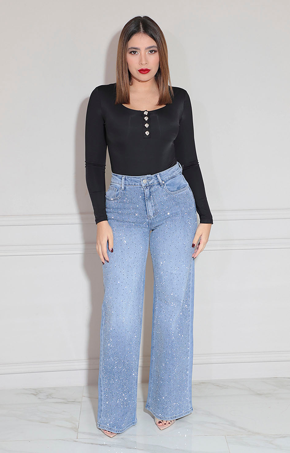 Pantalón de mezclilla con corte recto que combina el estilo clásico con un toque contemporáneo. Su acabado semi deslavado proporciona una apariencia relajada y versátil, mientras que los brillos estratégicamente distribuidos en toda la prenda añaden sofisticación y movimiento. Ideal para quienes buscan una pieza versátil que transita sin esfuerzo entre lo casual y lo elegante. Confeccionado con materiales de calidad que garantizan durabilidad y comodidad en el uso diario.
