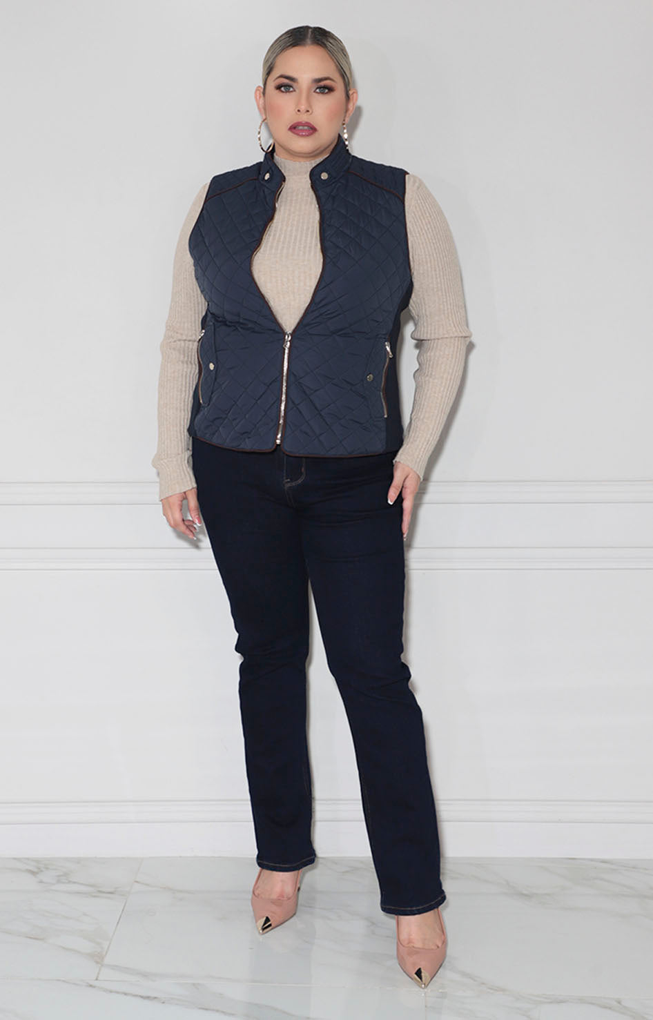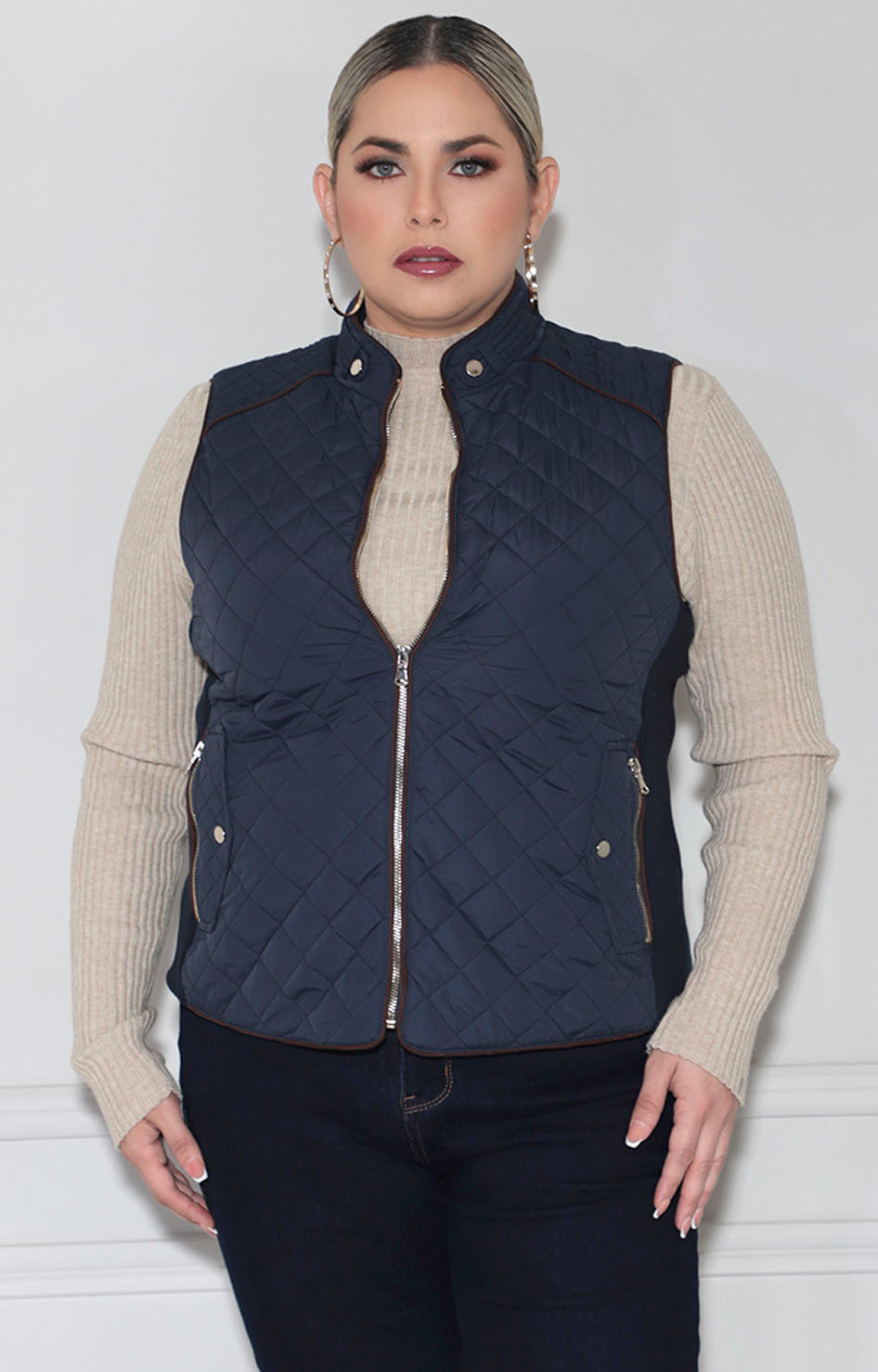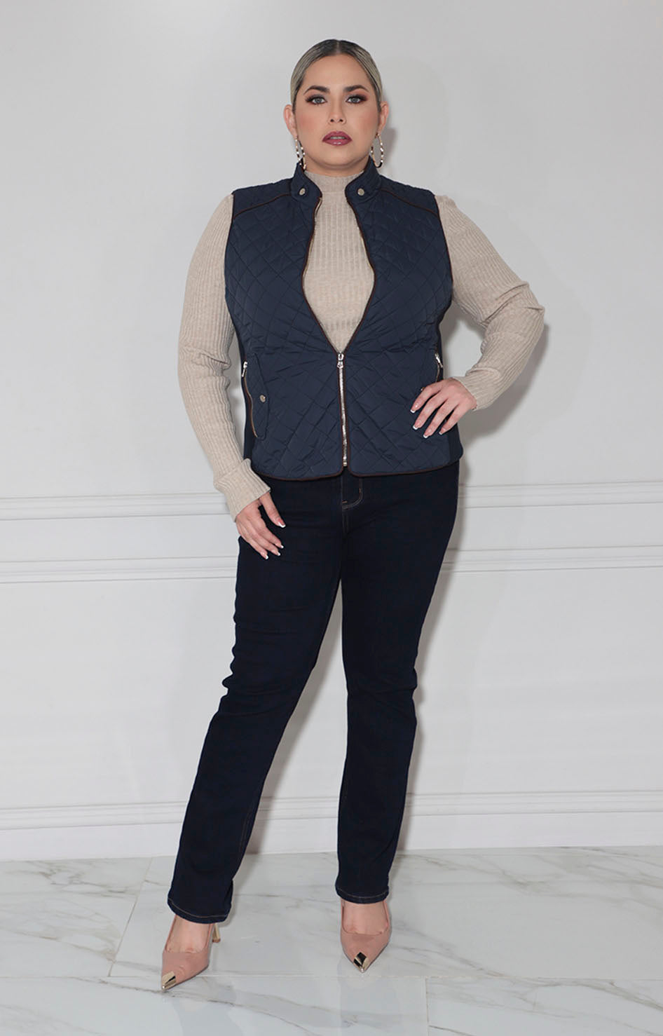 Chaleco azul marino confeccionado en tela suave que proporciona comodidad durante todo el día. Cuenta con un práctico cierre metálico al frente que facilita su uso, además de bolsillos laterales funcionales ideales para guardar objetos personales. Pieza versátil que se adapta a diferentes estilos y ocasiones, perfecta para crear looks casuales o más refinados según tus necesidades.
