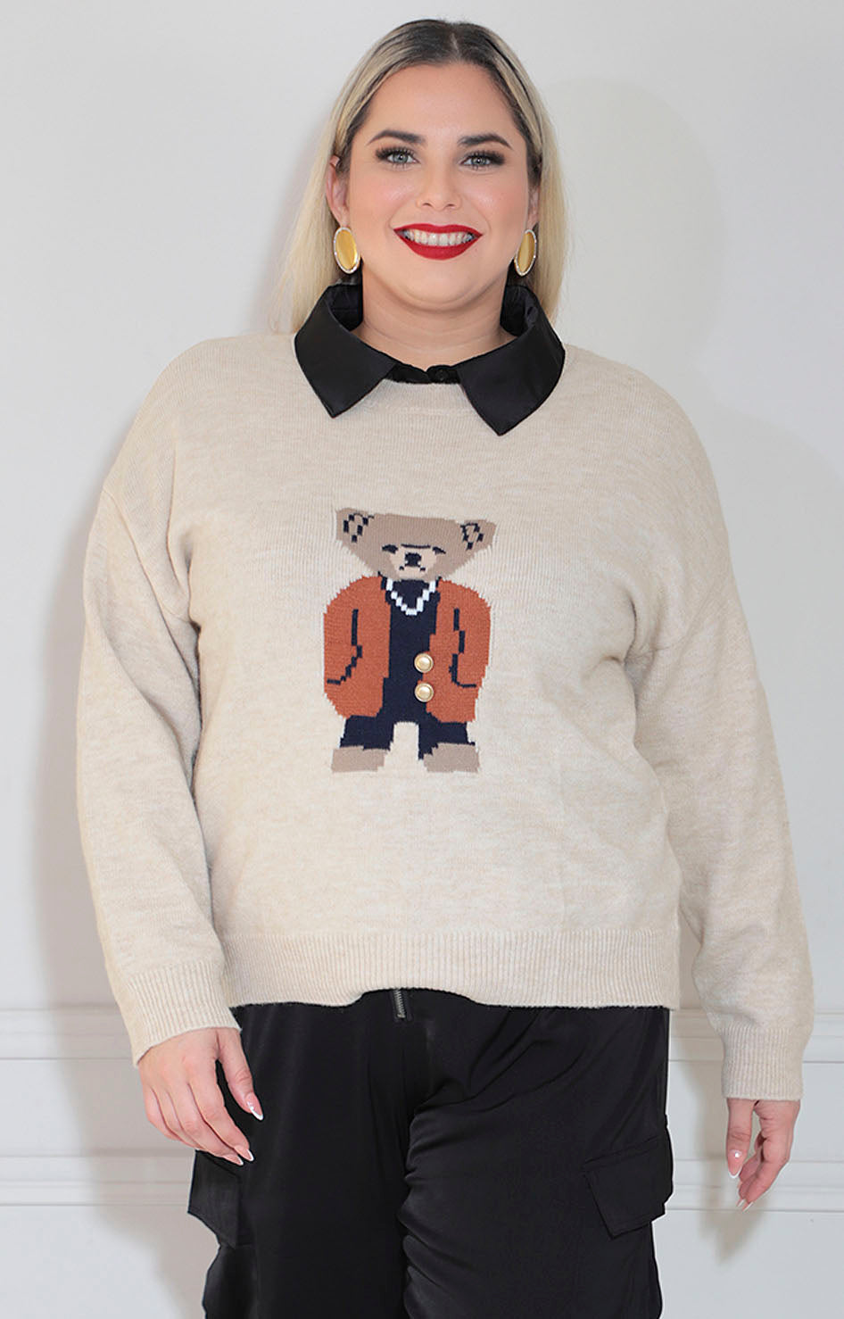 Suéter beige confeccionado en tela suave y reconfortante, ideal para las temporadas frías. Presenta manga larga que proporciona cobertura completa y cuello circular clásico que favorece cualquier tipo de rostro. Destaca por su adorable estampado de teddy al frente, añadiendo un toque tierno y contemporáneo al diseño. Prenda versátil que combina comodidad y estilo, perfecta para uso casual o como pieza base en tus outfits de invierno.