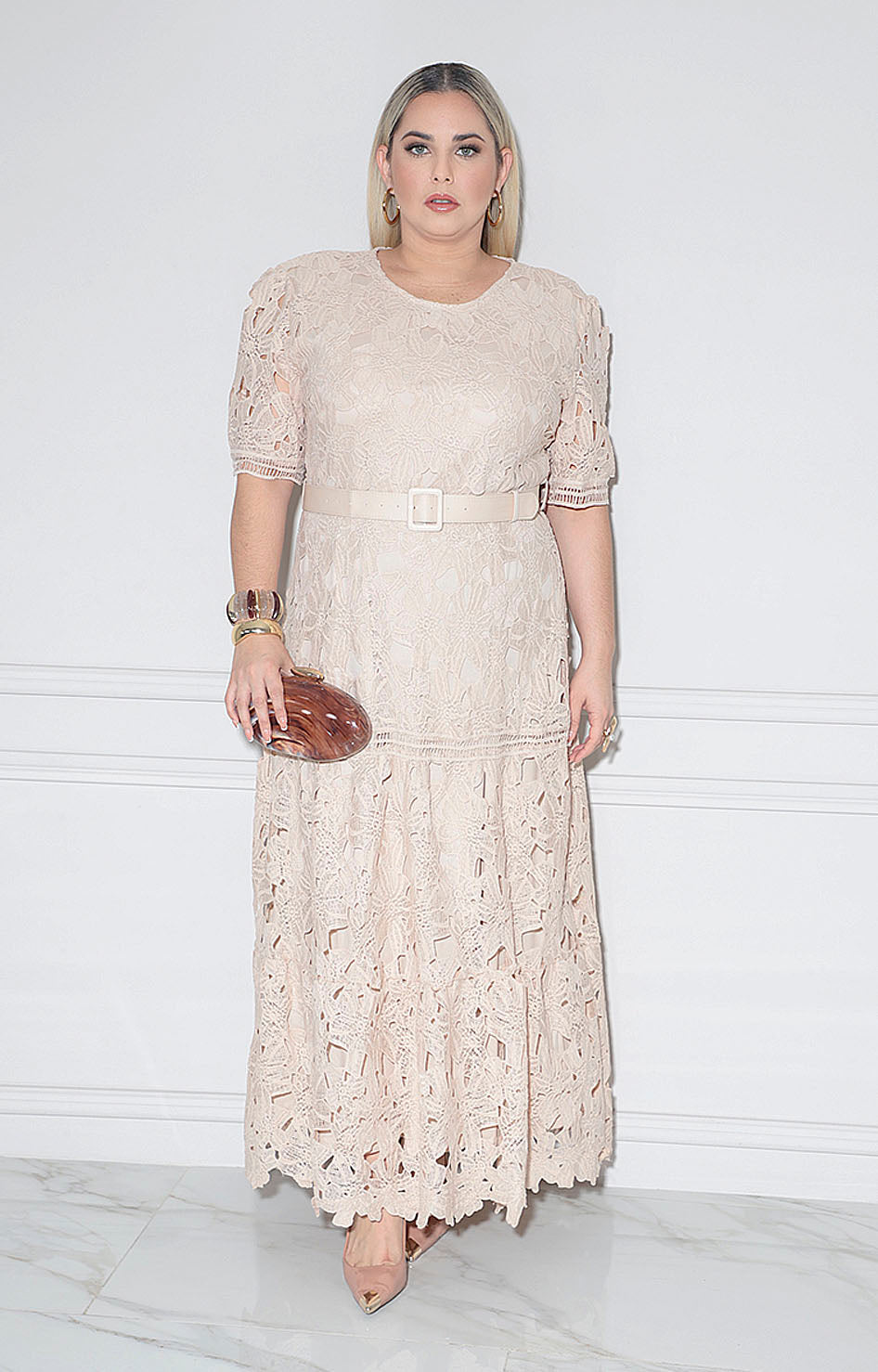 Vestido beige confeccionado en encaje delicado que ofrece una textura suave al tacto. Cuenta con cuello circular que proporciona un acabado elegante y versátil, permitiendo múltiples opciones de estilismo. Incluye cinturón a juego que define la silueta y añade sofisticación al diseño. Pieza versátil ideal para ocasiones especiales o uso cotidiano refinado.