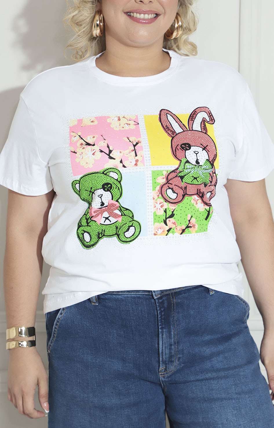 Esta blusa blanca destaca por su tacto suave y delicado, ideal para una sensación cómoda durante todo el día. Su estampado de teddys con brillos aporta un detalle único y sofisticado que añade un toque divertido y elegante a cualquier conjunto. Perfecta para quienes buscan combinar estilo y confort con un diseño detallado y moderno.