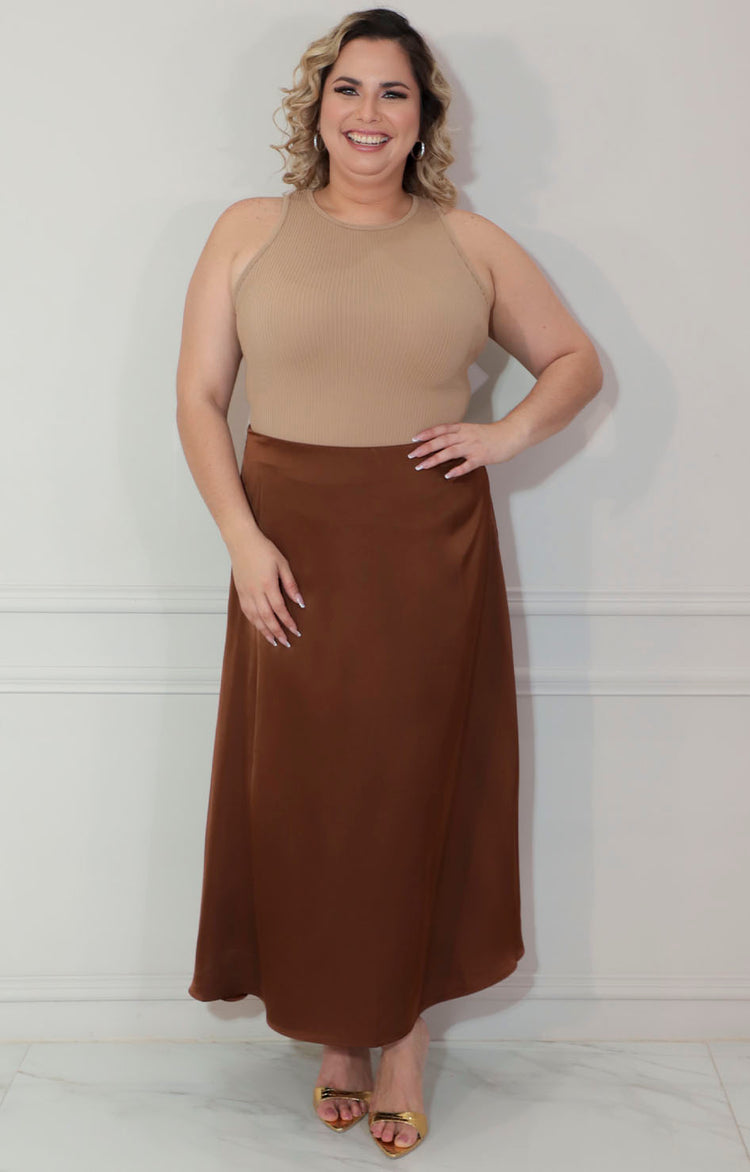 Esta falda café de corte circular con elástico combina comodidad y estilo. Su diseño fluido permite un movimiento natural, mientras que la pretina elástica asegura un ajuste adaptable y cómodo durante todo el día. Ideal para diversas ocasiones, aporta un toque elegante y versátil a cualquier guardarropa.