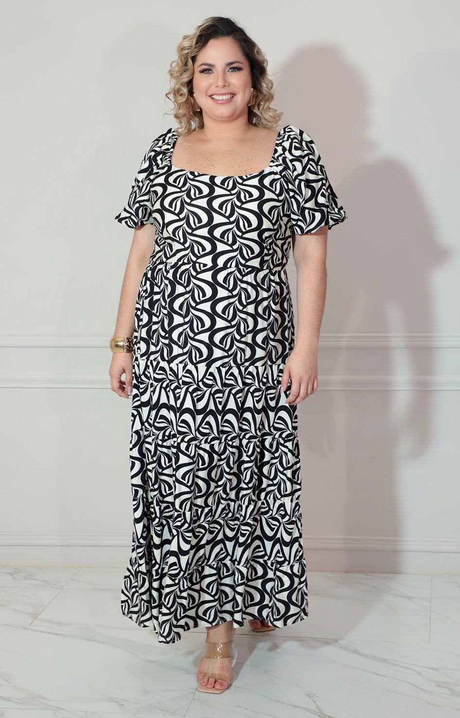 Este vestido negro estampado combina elegancia y comodidad gracias a sus mangas diseñadas para un ajuste perfecto y el elástico que realza la silueta. Ideal para diversas ocasiones, ofrece un estilo versátil que se adapta tanto a eventos casuales como formales. Su diseño cuidado garantiza un look sofisticado sin sacrificar la libertad de movimiento.