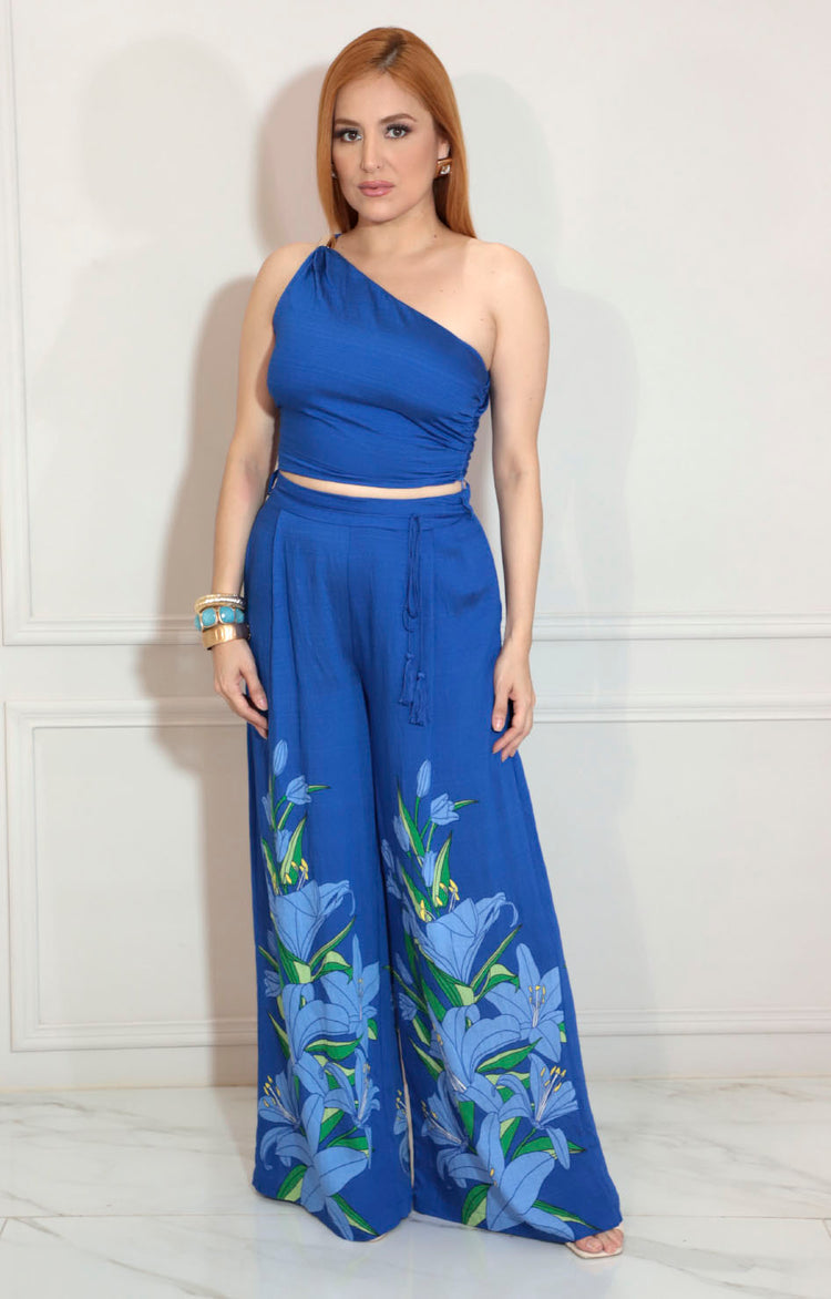 Este conjunto azul asimétrico con estampado combina diseño moderno y elegancia. Su corte asimétrico aporta un toque vanguardista, mientras que el estampado añade dinamismo visual. Ideal para quienes buscan una prenda que destaque por su estilo único y sofisticado, ofreciendo comodidad sin sacrificar presencia. Perfecto para ocasiones donde se desea un look contemporáneo y refinado.