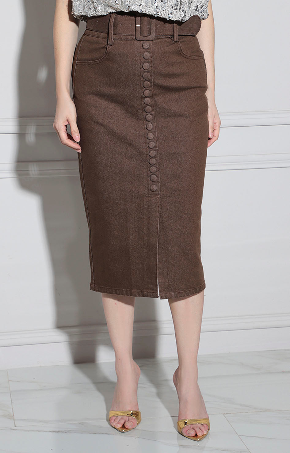 Falda de línea clásica en tono café que combina elegancia y funcionalidad. Diseñada con cinturón integrado que define la silueta y botones frontales que añaden detalle estructurado. Esta prenda versátil se adapta tanto a looks casuales como profesionales, ofreciendo comodidad sin comprometer el estilo. Perfecta para crear outfits sofisticados en cualquier ocasión.