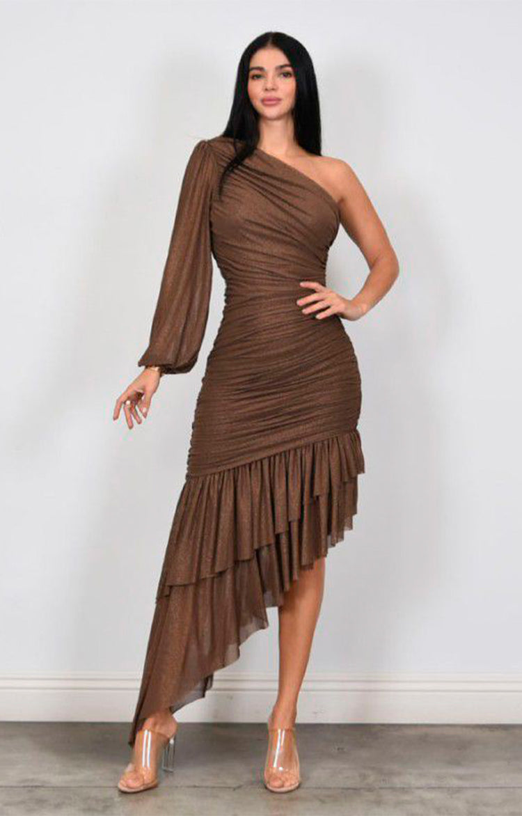 Vestido asimétrico en tonalidad café que combina elegancia con diseño contemporáneo. Presenta un corte irregular que favorece la silueta, complementado con un volante en la parte inferior que añade movimiento y dinamismo. La manga larga en el lado derecho proporciona un toque sofisticado y diferenciador. Pieza versátil ideal para ocasiones especiales o looks cotidianos con carácter. Confeccionado con atención al detalle para garantizar comodidad y estilo.