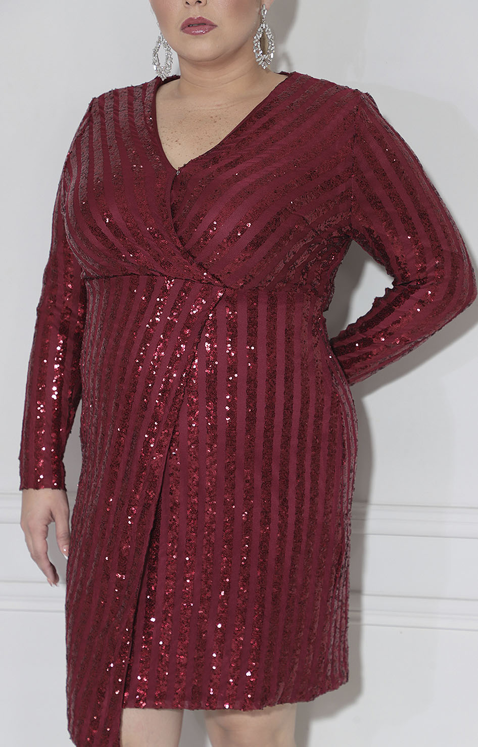 Vestido en tono vino que combina elegancia y comodidad. Confeccionado en tela suave al tacto, cuenta con mangas largas que proporcionan una cobertura sofisticada. El escote en V realza la silueta de manera favorecedora, mientras que el cierre en la espalda permite un ajuste personalizado. Los detalles con lentejuela añaden un toque de brillo y distinción, perfecto para ocasiones especiales donde deseas destacar con estilo refinado.