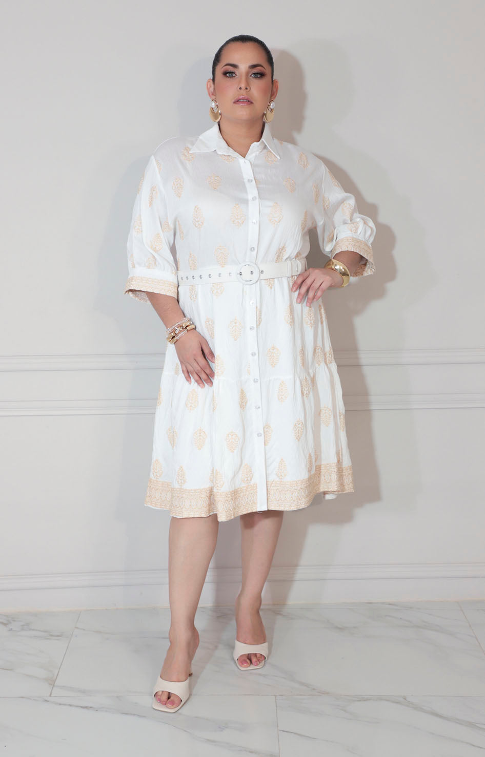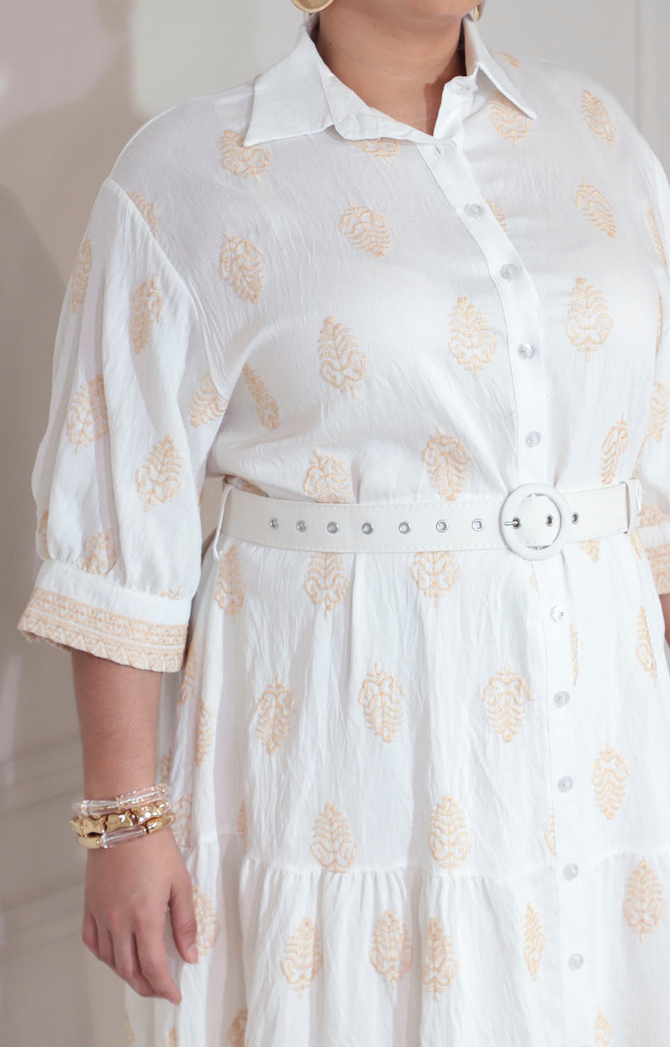 El delicado bordado añade un toque femenino y artesanal, mientras que los botones al frente le dan estructura. Incluye un cinturón que define tu cintura y resalta tu silueta, adaptándose a todo tipo de cuerpo.