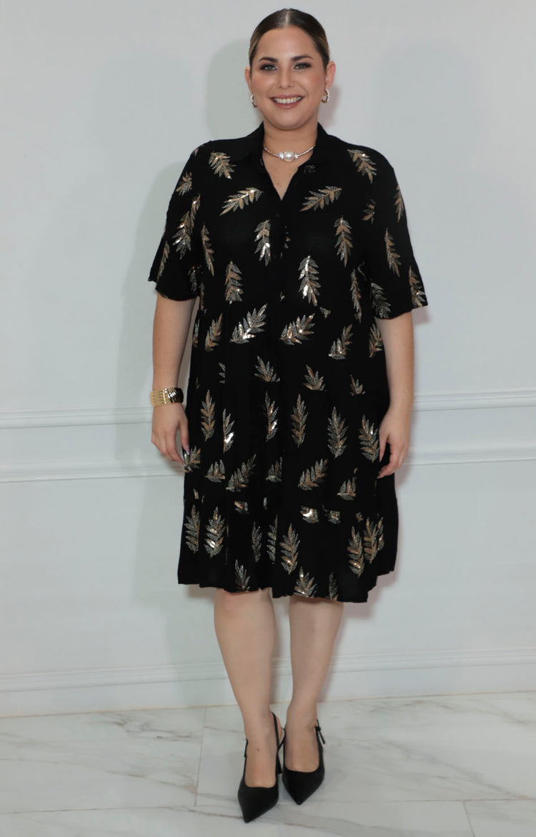 Suave al tacto con botones al frente, bordado en lentejuela dorada formando flores en diselo orgánico. Estilo del vestido camisero, manga cuadrada.