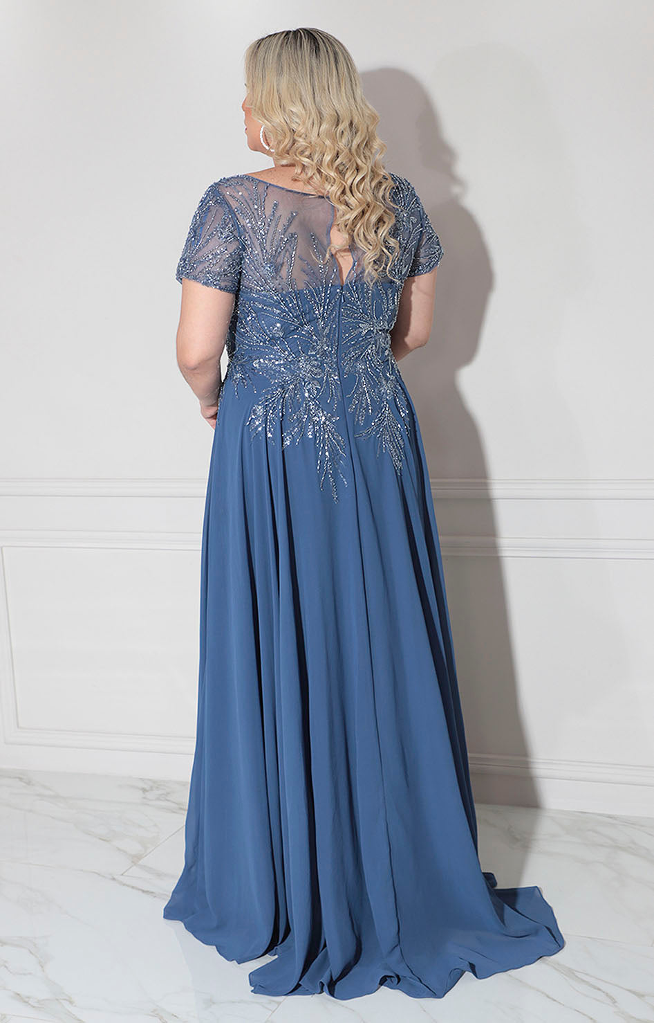 Vestido azul confeccionado en tela suave que proporciona comodidad durante todo el día. Destaca por su elegante bordado en pedrería en la zona superior, que añade un toque de sofisticación y brillo. El faldón circular ofrece movimiento fluido y una silueta favorecedora. Cierre funcional en la espalda para un ajuste seguro, complementado con mangas cortas ideales para diferentes ocasiones. Una pieza versátil que combina estilo y practicidad.