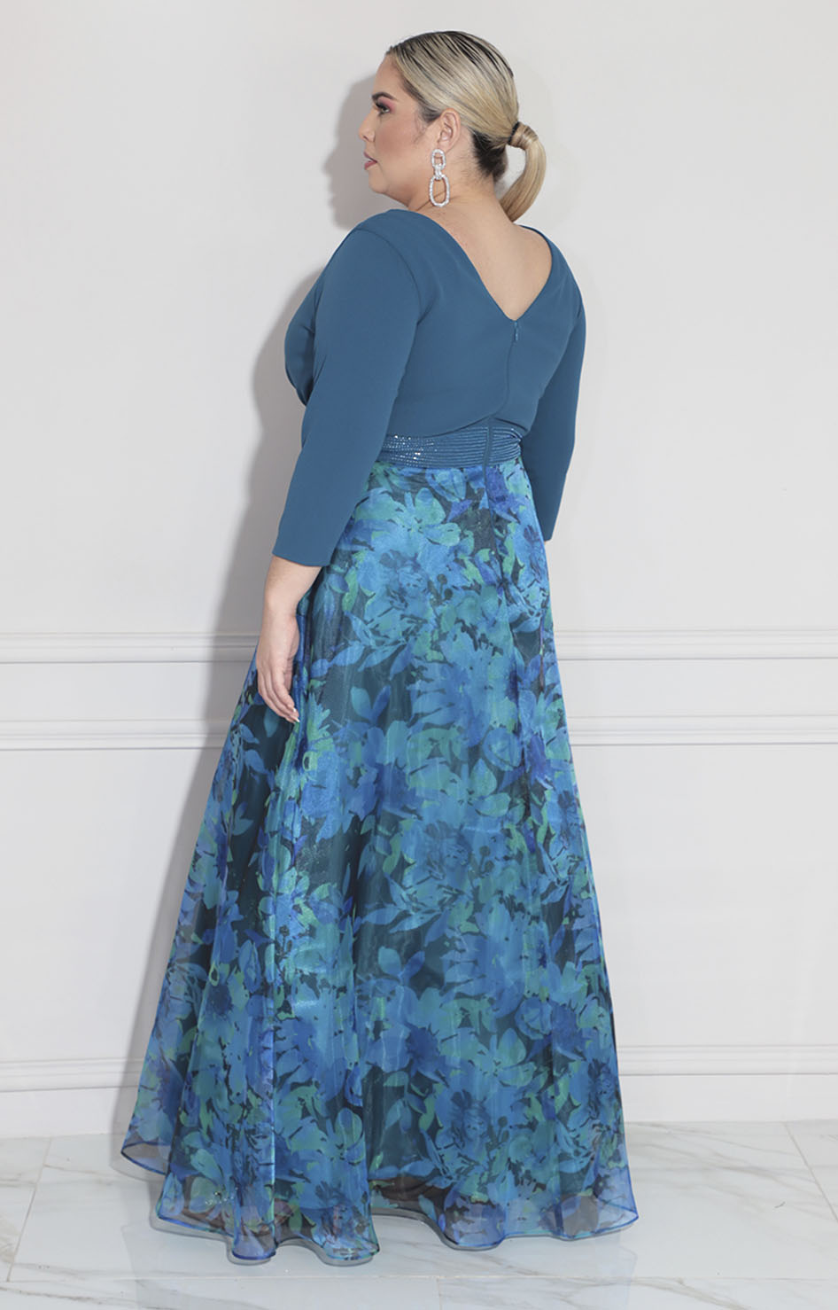 Vestido azul de gala confeccionado en tela suave que proporciona comodidad y elegancia durante toda la noche. Presenta mangas estilo 3/4 que ofrecen un equilibrio perfecto entre sofisticación y practicidad. Destaca una cenefa decorativa en la cintura adornada con pedrería que realza la silueta y añade un toque de brillo. El cierre estratégico en la espalda facilita el ajuste perfecto y crea un detalle de diseño exclusivo. Ideal para eventos formales y ocasiones especiales donde deseas lucir radiante.