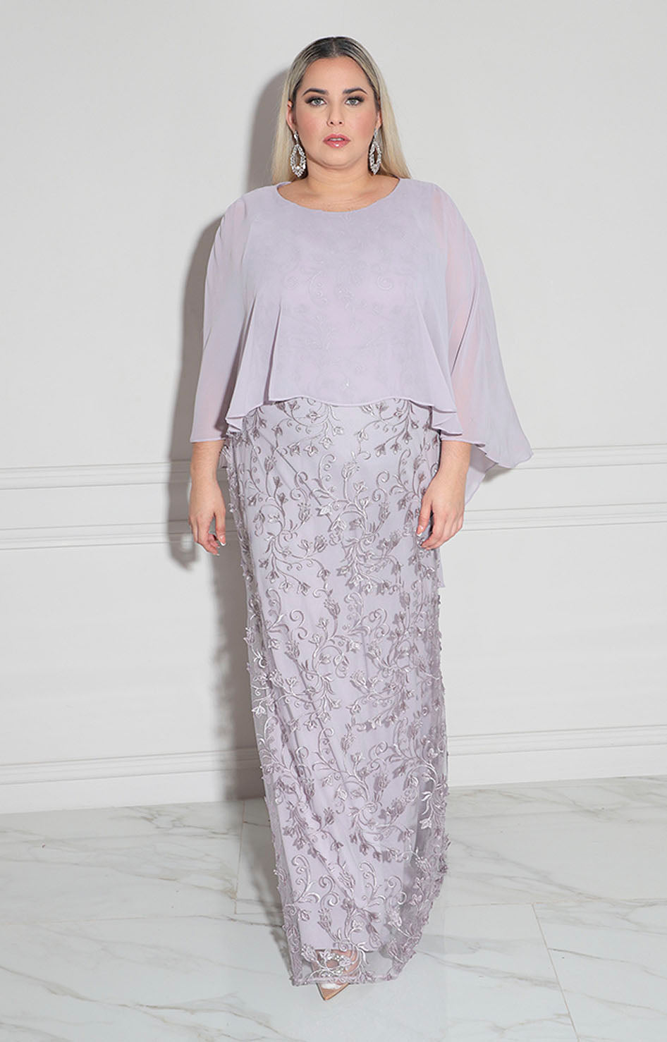 Vestido de gala en tonalidad lila que combina elegancia y sofisticación. Confeccionado en tela suave al tacto que proporciona comodidad durante todo el evento. Destaca por su cuello circular clásico y solapa estructurada que define la silueta. El relieve en 3D formando flores añade profundidad y movimiento visual, creando un efecto artístico que lo diferencia. Ideal para ocasiones especiales donde deseas proyectar distinción y estilo refinado.