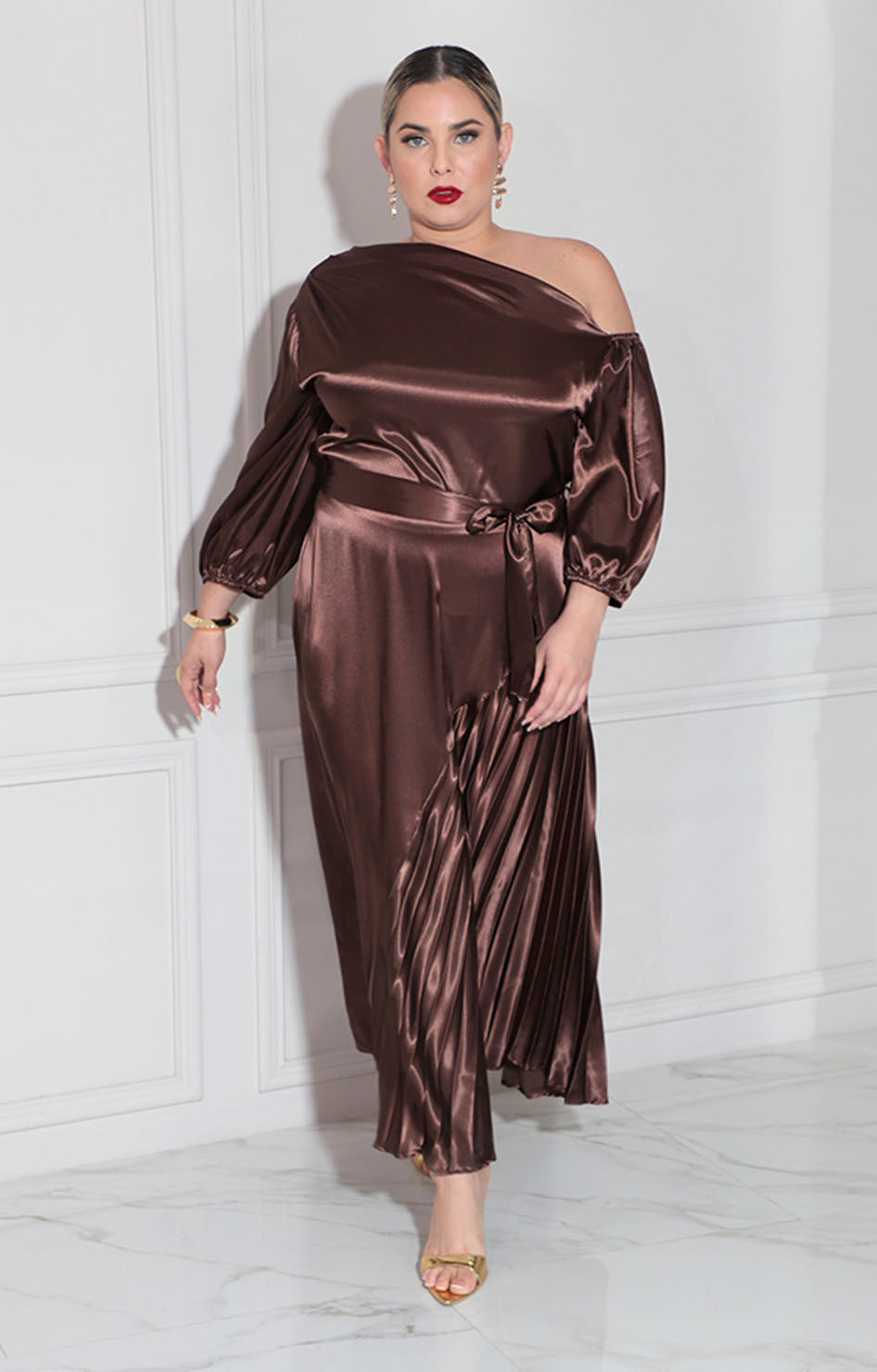 Vestido confeccionado en satén café, una tela de acabado liso y brillante que proporciona elegancia y movimiento. Este diseño se adapta perfectamente a diferentes siluetas, ofreciendo comodidad sin comprometer el estilo. La modelo fotografiada viste talla 1XL, lo que permite visualizar cómo se ajusta la prenda en esta medida. Ideal para ocasiones especiales, cenas o eventos donde desees lucir sofisticada y refinada.