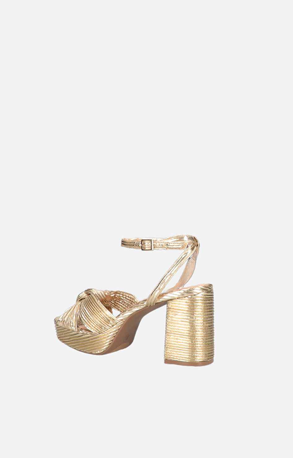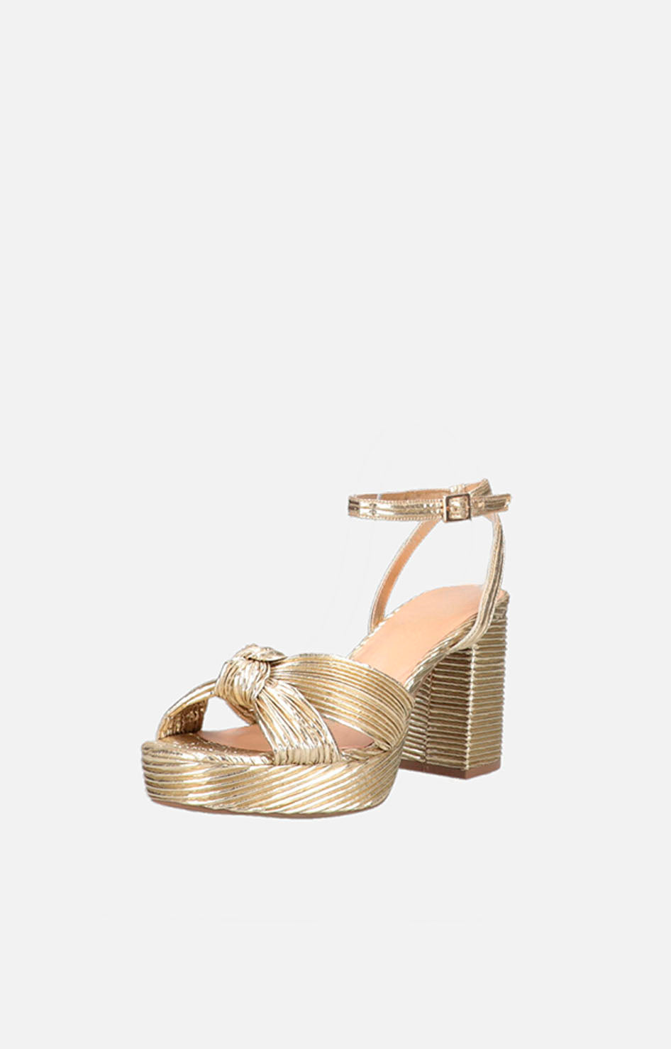 Esta plataforma dorada mate está cuidadosamente forrada con tela plisada que aporta textura y sofisticación. Cuenta con una pulsera ajustable en el tobillo para un soporte seguro y cómodo, mientras que el nudo en la zona superior añade un detalle elegante y distintivo. Ideal para quienes buscan un calzado con estilo y comodidad, esta plataforma fusiona diseño y funcionalidad de manera experta.