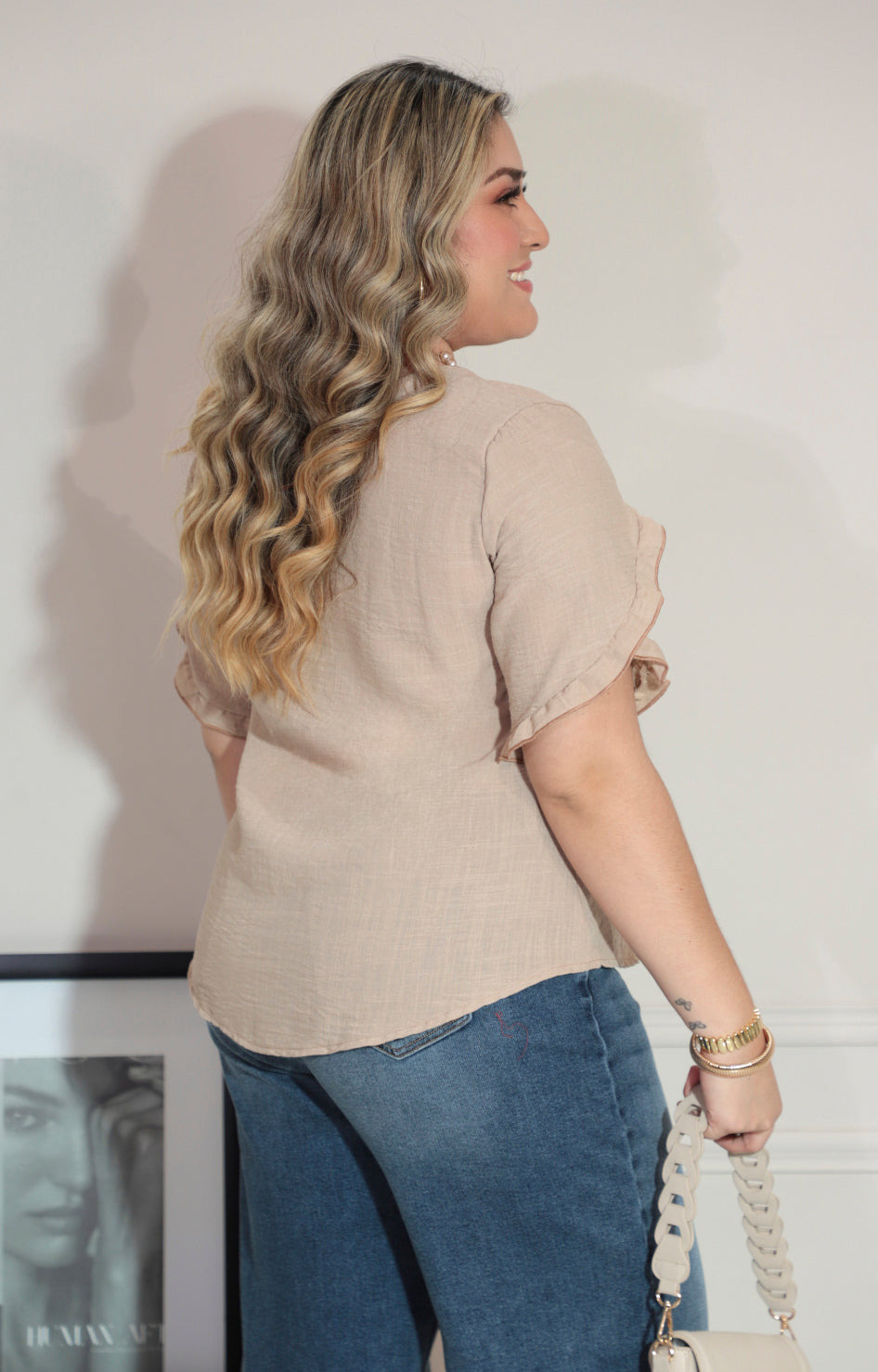 Elegante blusa beige de diseño liso que destaca por sus delicados volantes en las mangas, aportando un toque femenino y sofisticado. Perfecta para combinar con diferentes prendas, te brindará comodidad y estilo en cualquier ocasión, desde el trabajo hasta eventos casuales.