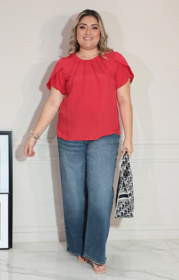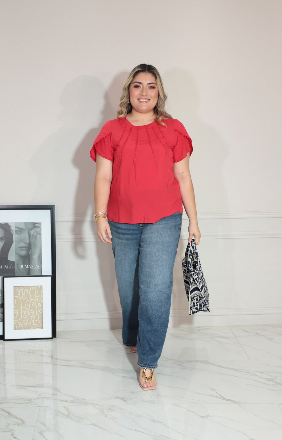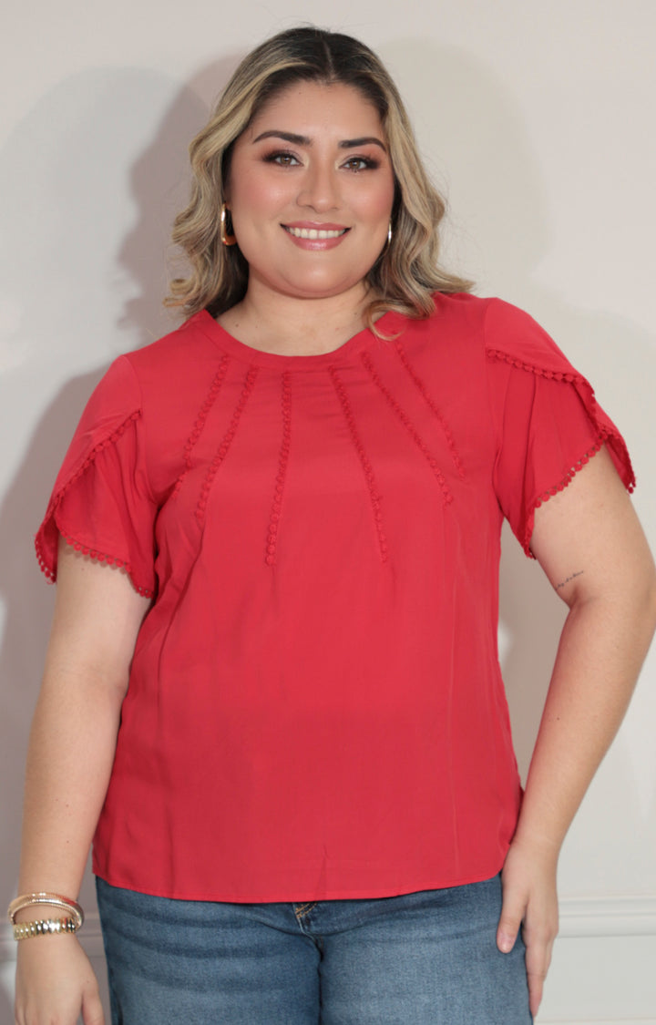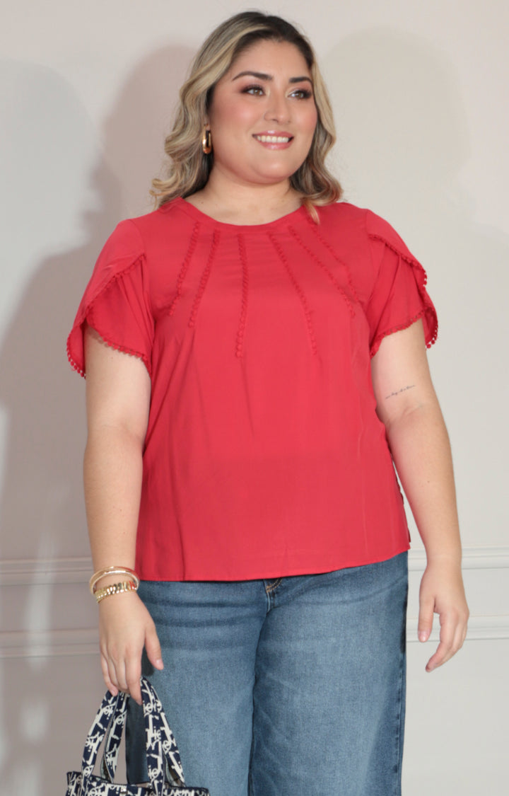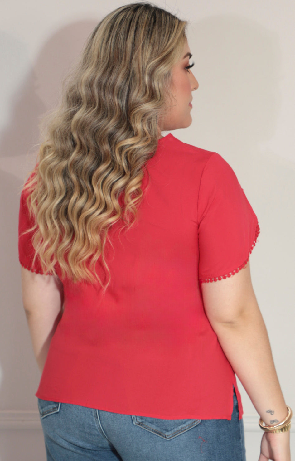 Elegante blusa roja que destaca por su delicado bordado frontal y mangas detalladas. Su diseño versátil te permite lucir sofisticada en cualquier ocasión, mientras el color vibrante realza tu presencia. El bordado artesanal añade un toque único y personal a esta prenda esencial para tu guardarropa.