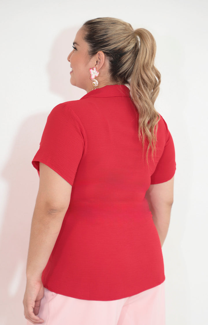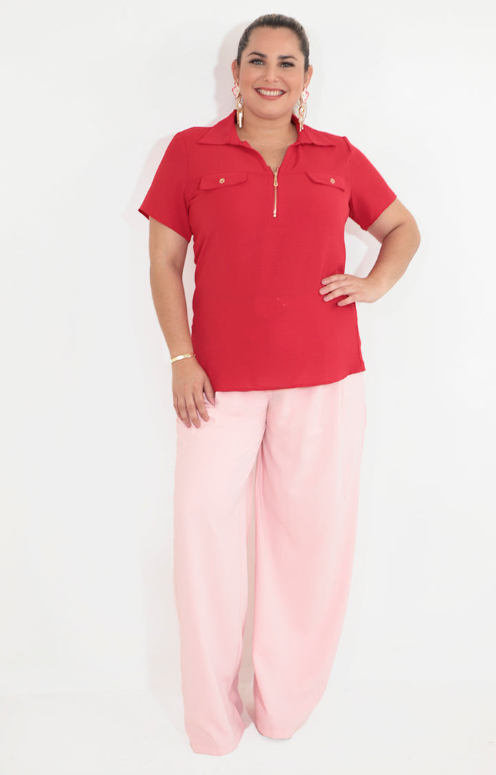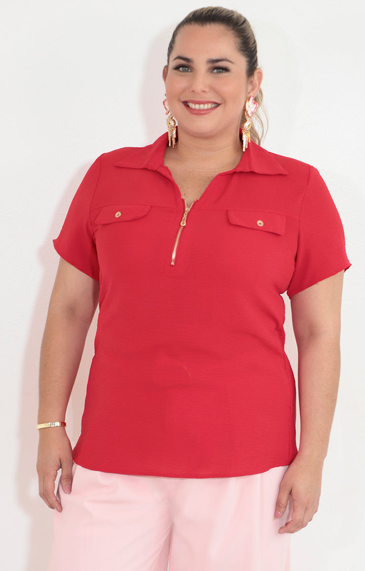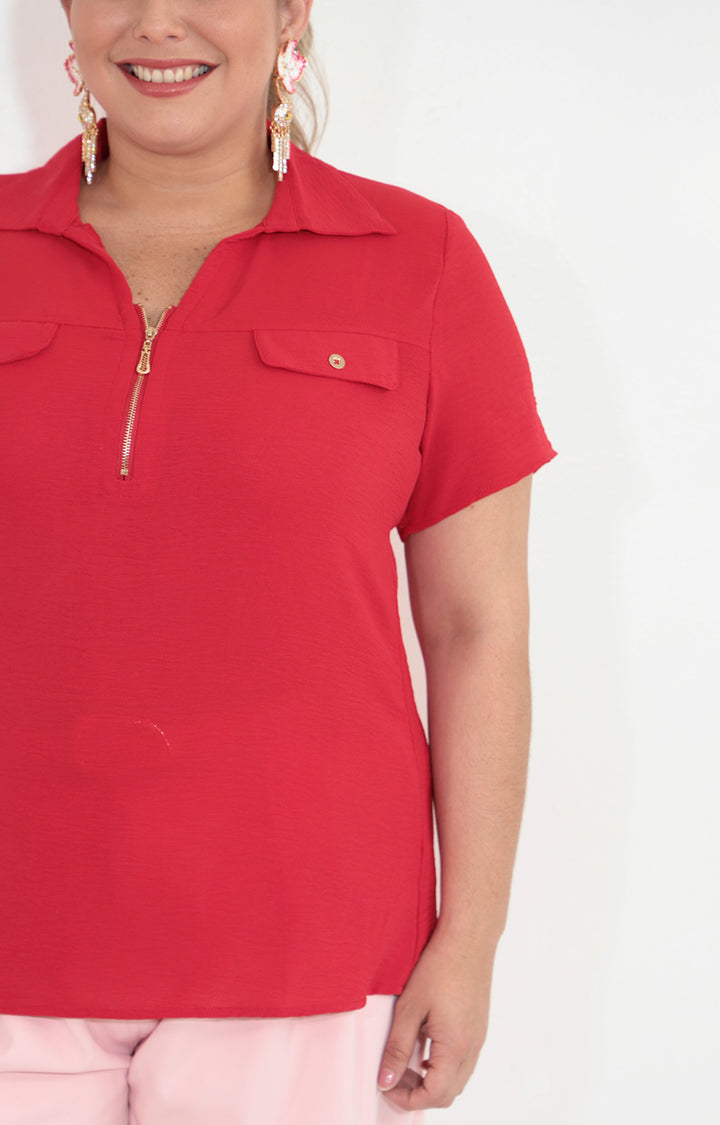 Blusa roja con cierre y bolsas frontal
