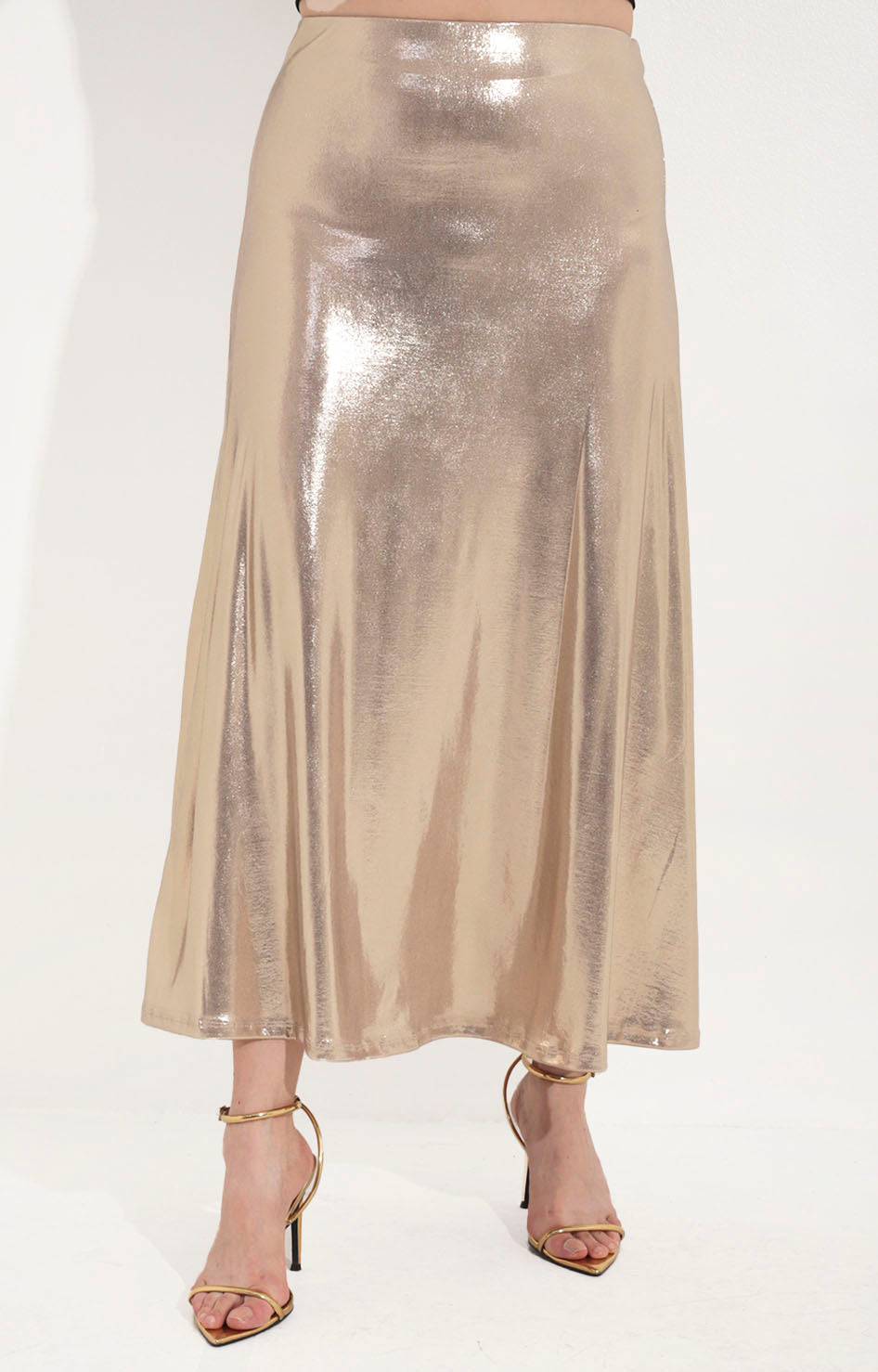 Deslumbra con esta falda dorada midi, una prenda que combina glamour y elegancia en un diseño que te hará destacar. Su acabado brillante aporta un toque sofisticado y moderno, perfecto para ocasiones especiales o para elevar cualquier look casual con un giro único.
