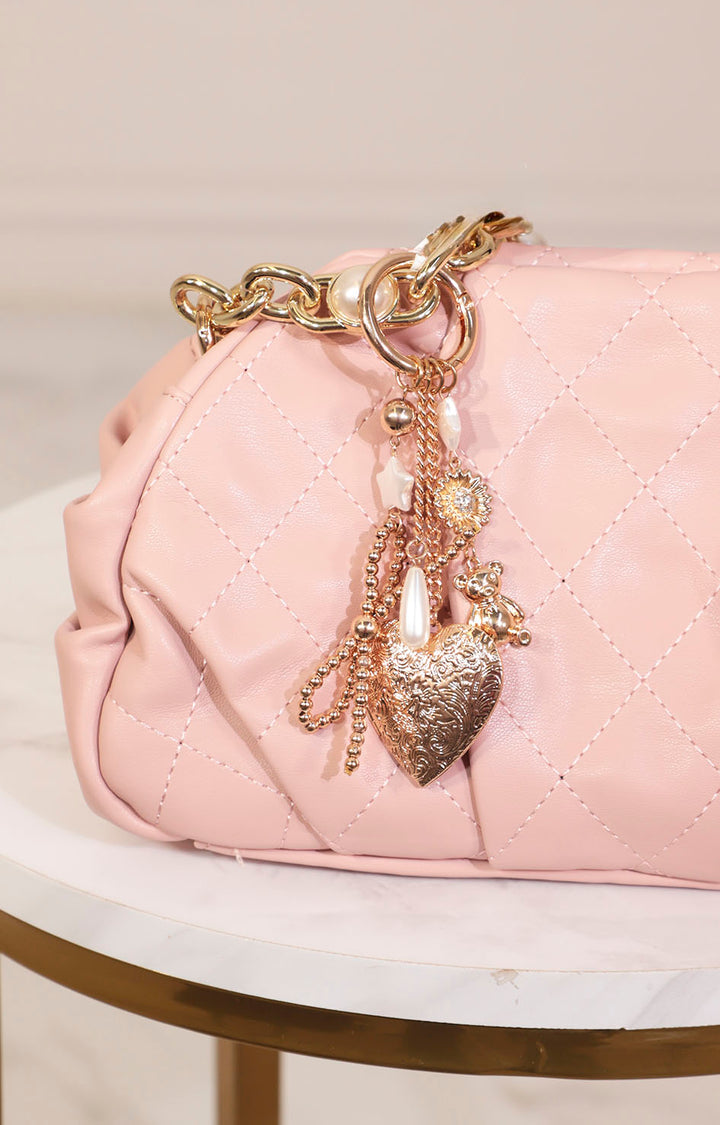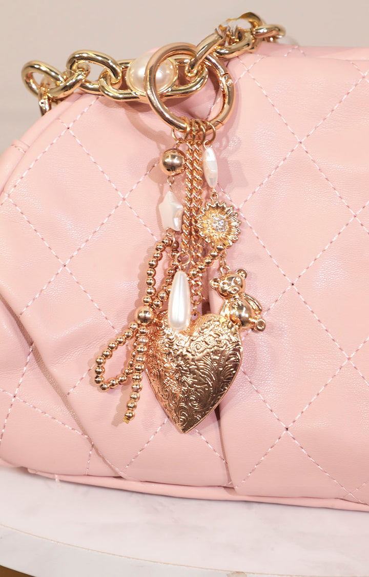 Un accesorio que roba miradas y eleva cualquier bolso al siguiente nivel. Este charm dorado de inspiración vintage combina elegancia y ternura en cada detalle: corazón grabado, osito brillante, perlas, y una flor tipo girasol con centro de cristal.