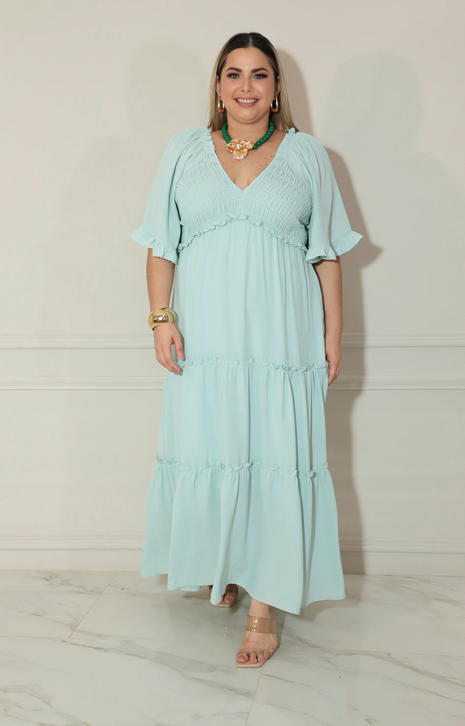 Este vestido verde destaca por su diseño con elástico en la parte superior, que garantiza un ajuste cómodo y favorecedor. Las mangas cuentan con un delicado volante que añade un toque de elegancia y movimiento, ideal para ocasiones casuales o eventos especiales. Su confección permite libertad de movimiento sin sacrificar estilo, convirtiéndolo en una prenda versátil y sofisticada para cualquier guardarropa.