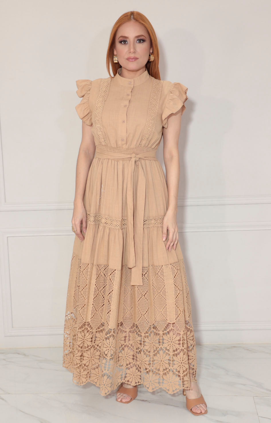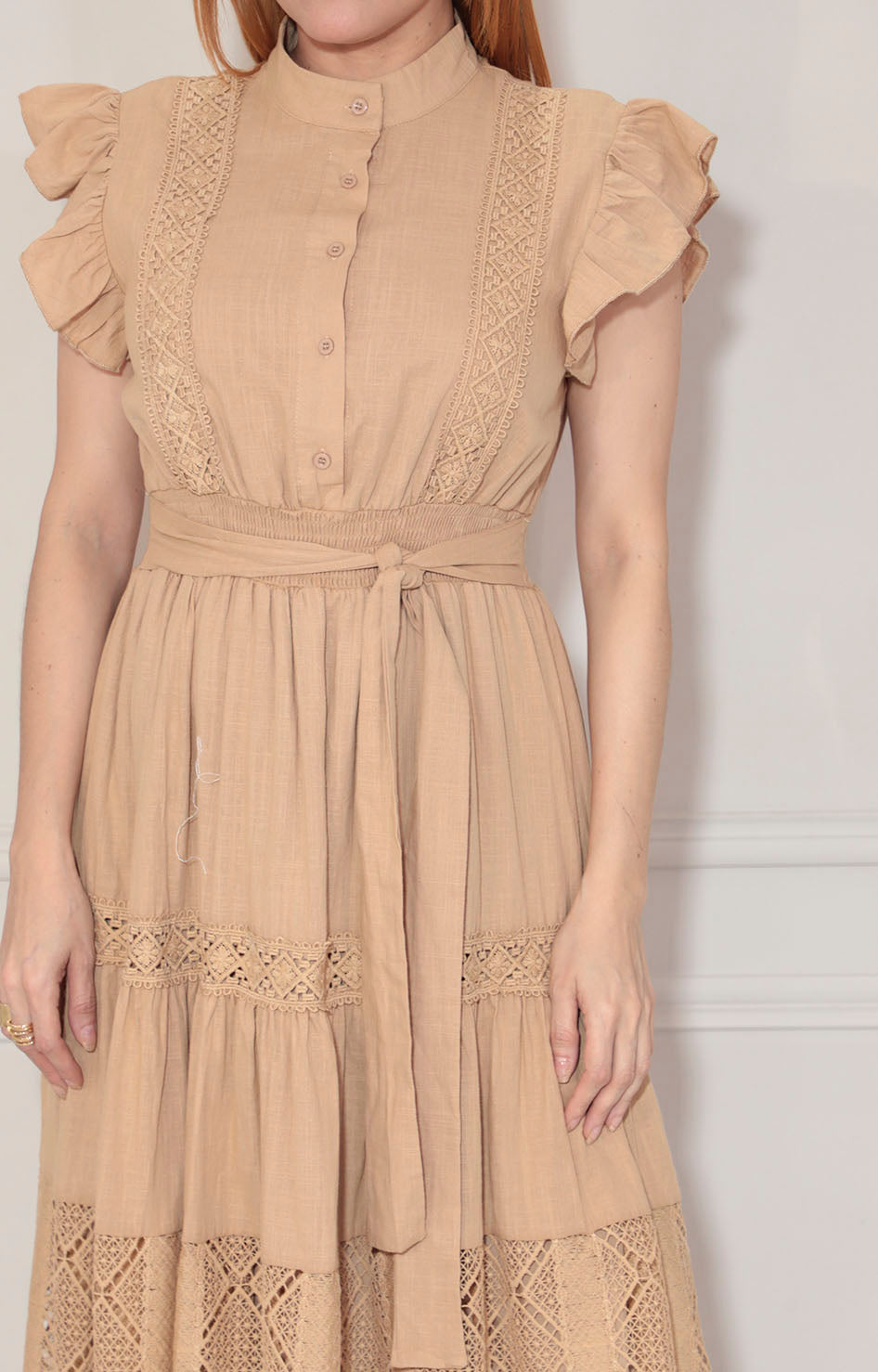 Este vestido beige presenta un diseño sofisticado con cuello mao que aporta estructura y elegancia. Sus mangas con volantes ofrecen un toque femenino y movimiento, mientras que la tira bordada en tono similar añade un detalle delicado y texturizado. Su tejido suave al tacto garantiza comodidad durante todo el día, combinando estilo y funcionalidad en una prenda versátil para diversas ocasiones.