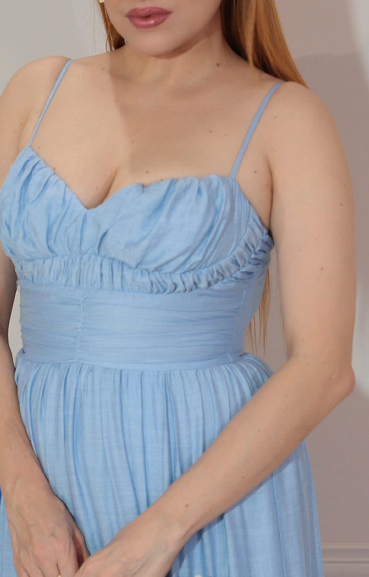 Este vestido azul de tirantes destaca por su diseño con fruncido frontal, que realza la figura de manera elegante y cómoda. Perfecto para cualquier ocasión, su estilo fresco y femenino te brinda confianza y comodidad durante todo el día. Ideal para combinar con accesorios sencillos y lucir un look natural y encantador.
