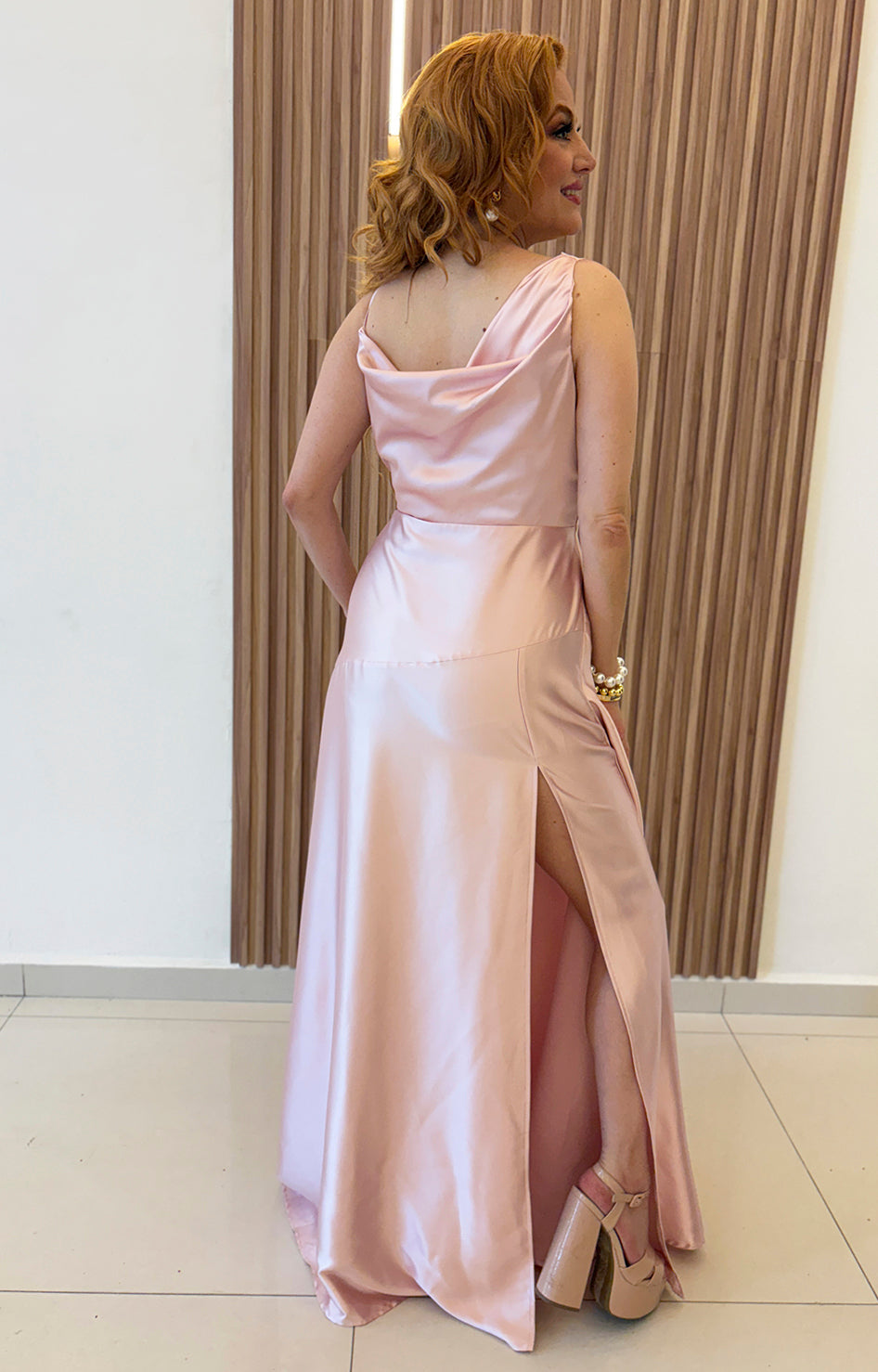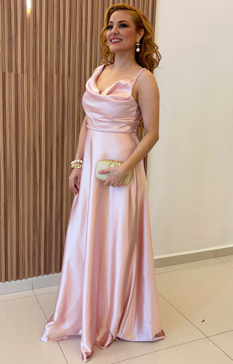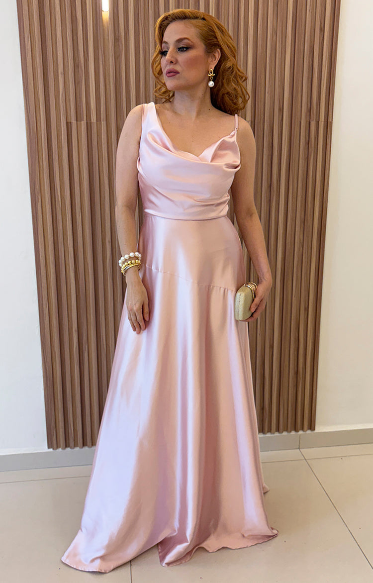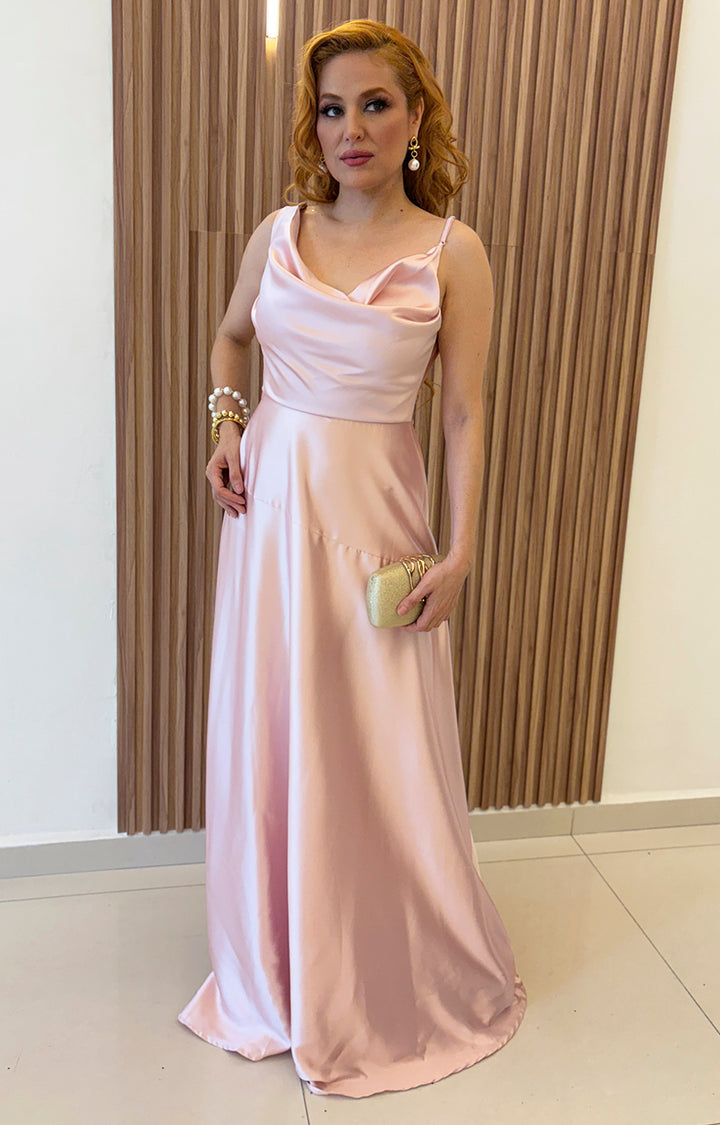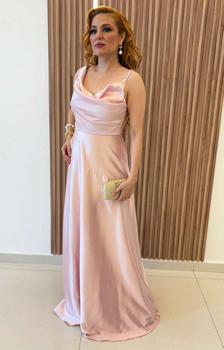 Vestido rosa asimetrico de tirantes con cuello de hamaca