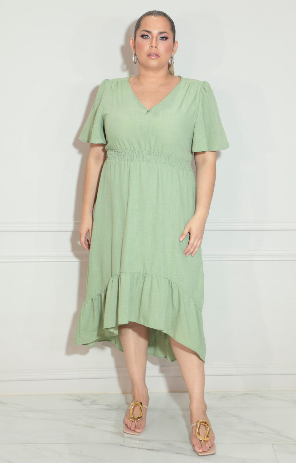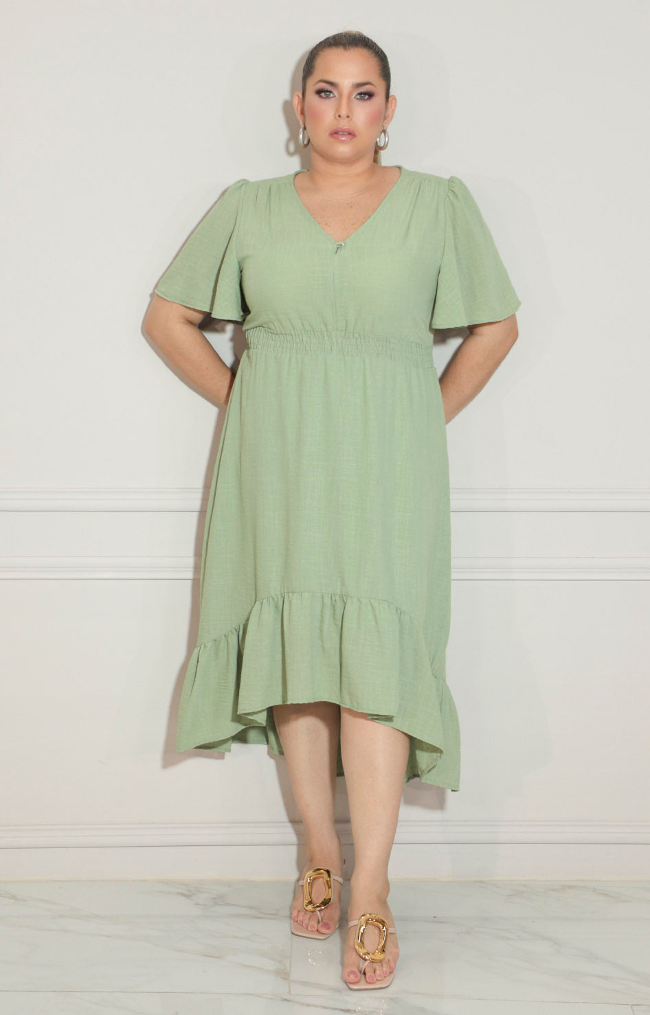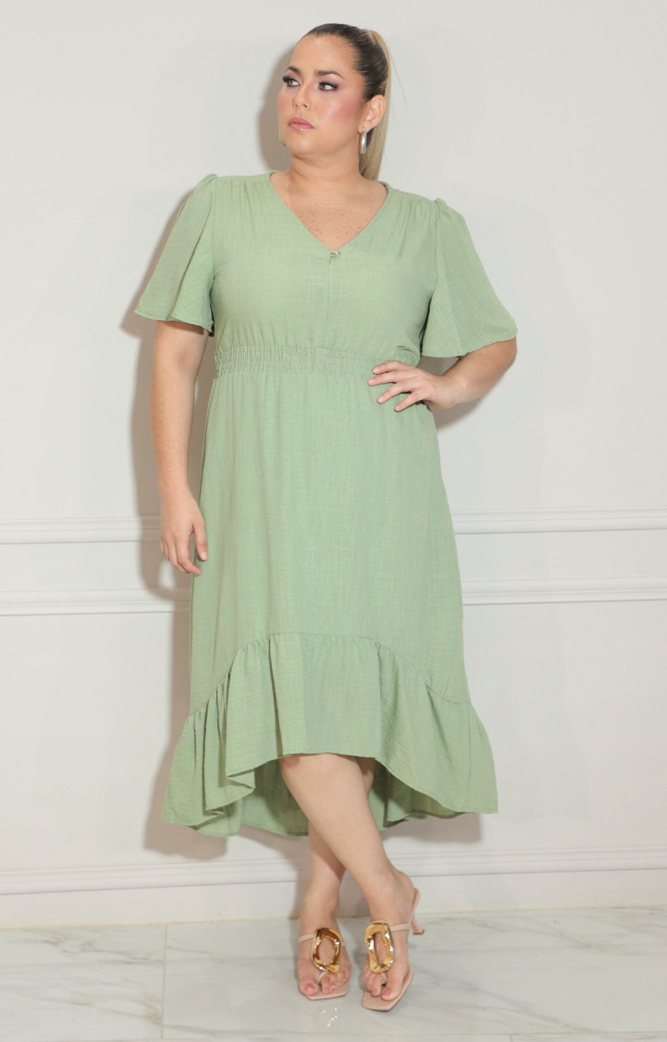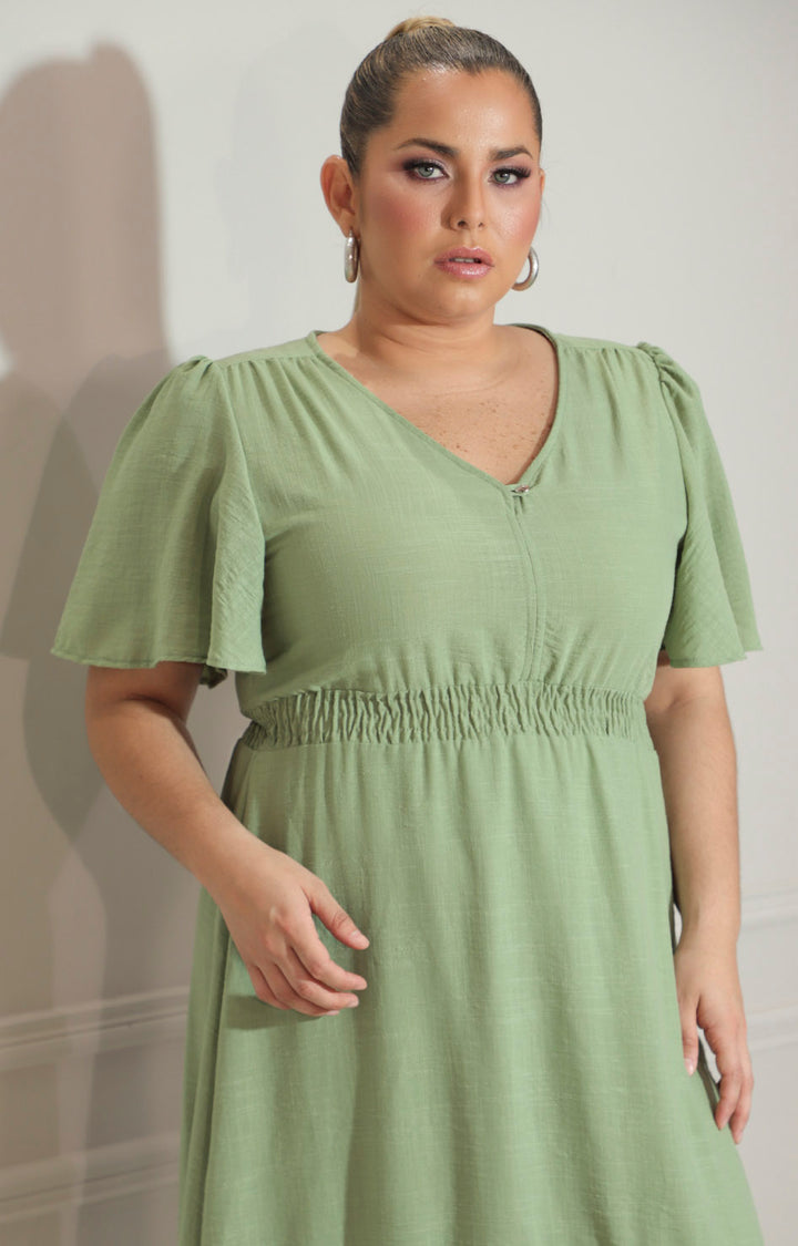 Vestido verde con elástico en cintura y volante