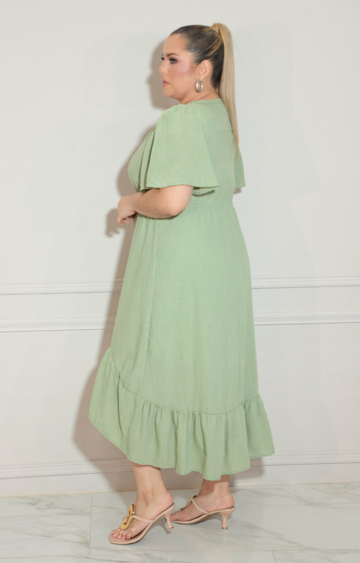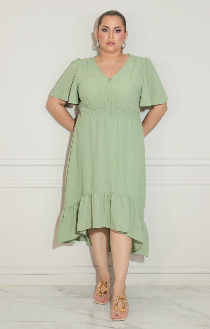 Elegante vestido verde que combina comodidad y estilo con su cintura elástica que se adapta perfectamente a tu figura. El detalle del volante añade un toque femenino y movimiento a tu look, ideal para cualquier ocasión especial o uso diario. Su diseño versátil te permite lucir radiante con mínimo esfuerzo.