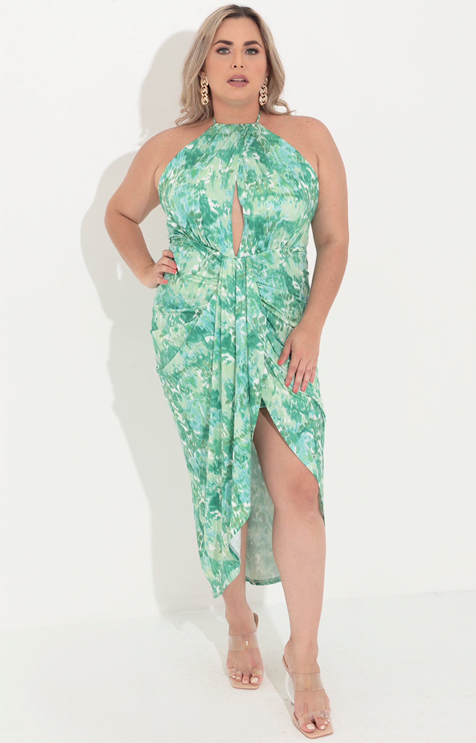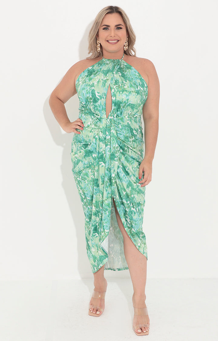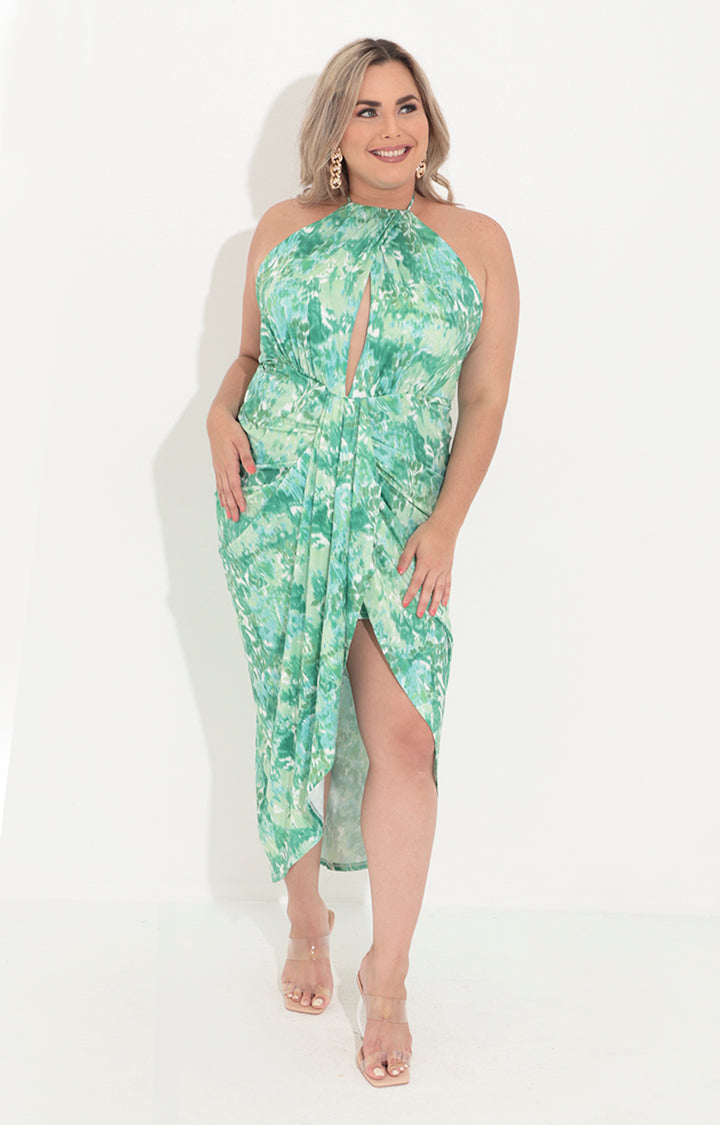 Disfruta de la elegancia y exclusividad con nuestro vestido verde estampado en blanco. Su vuello halter y apertura en el busto lo hacen perfecto para lucir sofisticada y sensual. Déjate llevar por su diseño artístico y atrévete a ser la envidia de todos. ¡Hazte notar con este hermoso vestido!